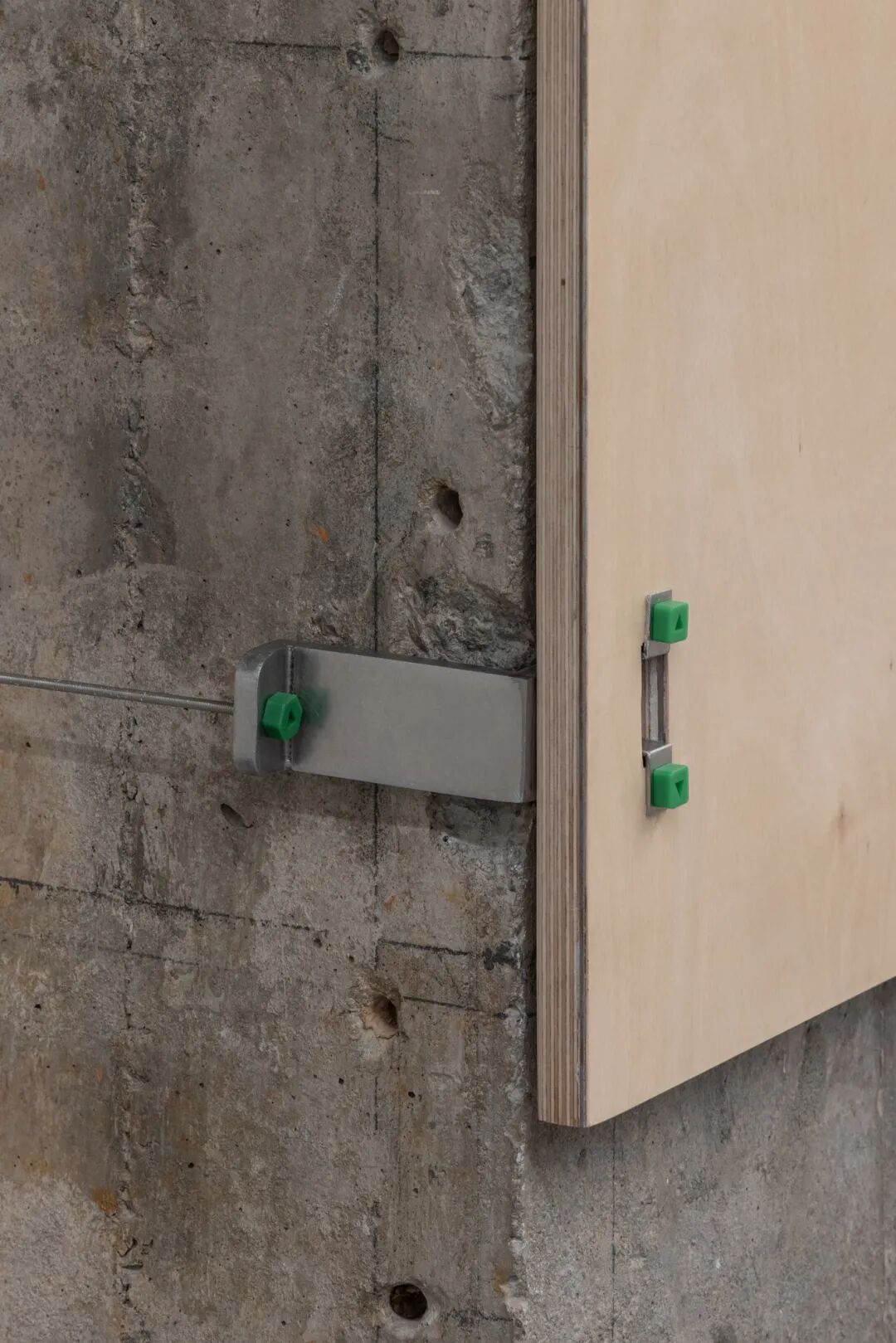 所有的连接的方式都被以暴露的节点做了突出表达,空调固定件上的钩子、天花板的长螺丝、墙面上的绿色节点...都真实变为空间独特的「记号」。