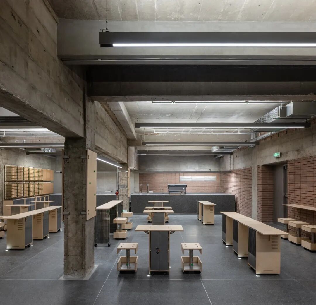而不加修饰的混凝土立柱、粗糙砖墙,让人瞬间怀疑是不是误入了施工现场,环绕水泥柱的环形置物架,也是公园里大树旁座椅的解构设计。