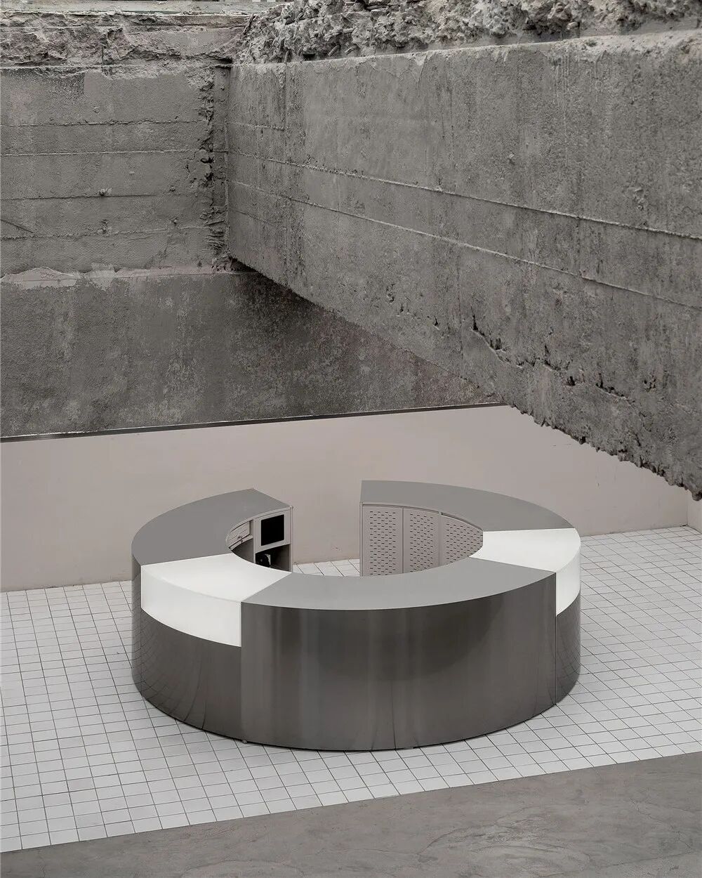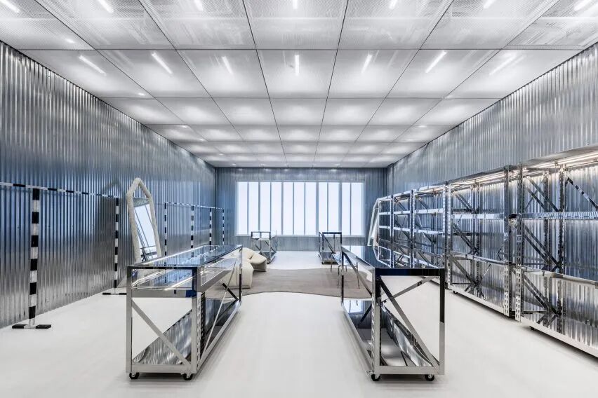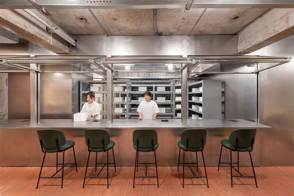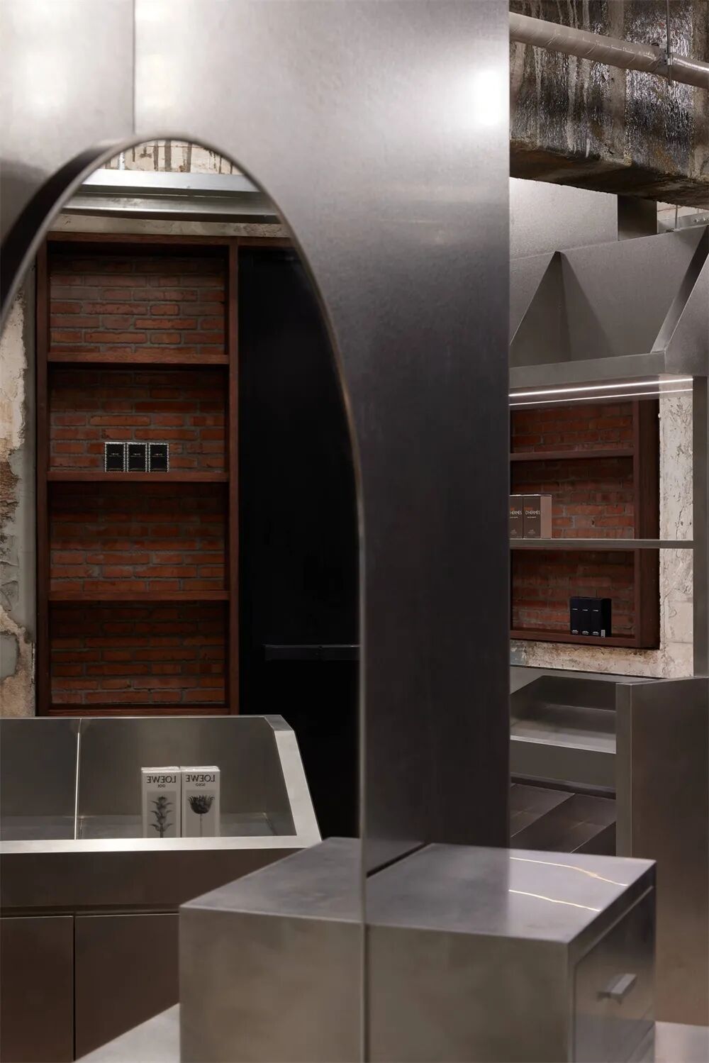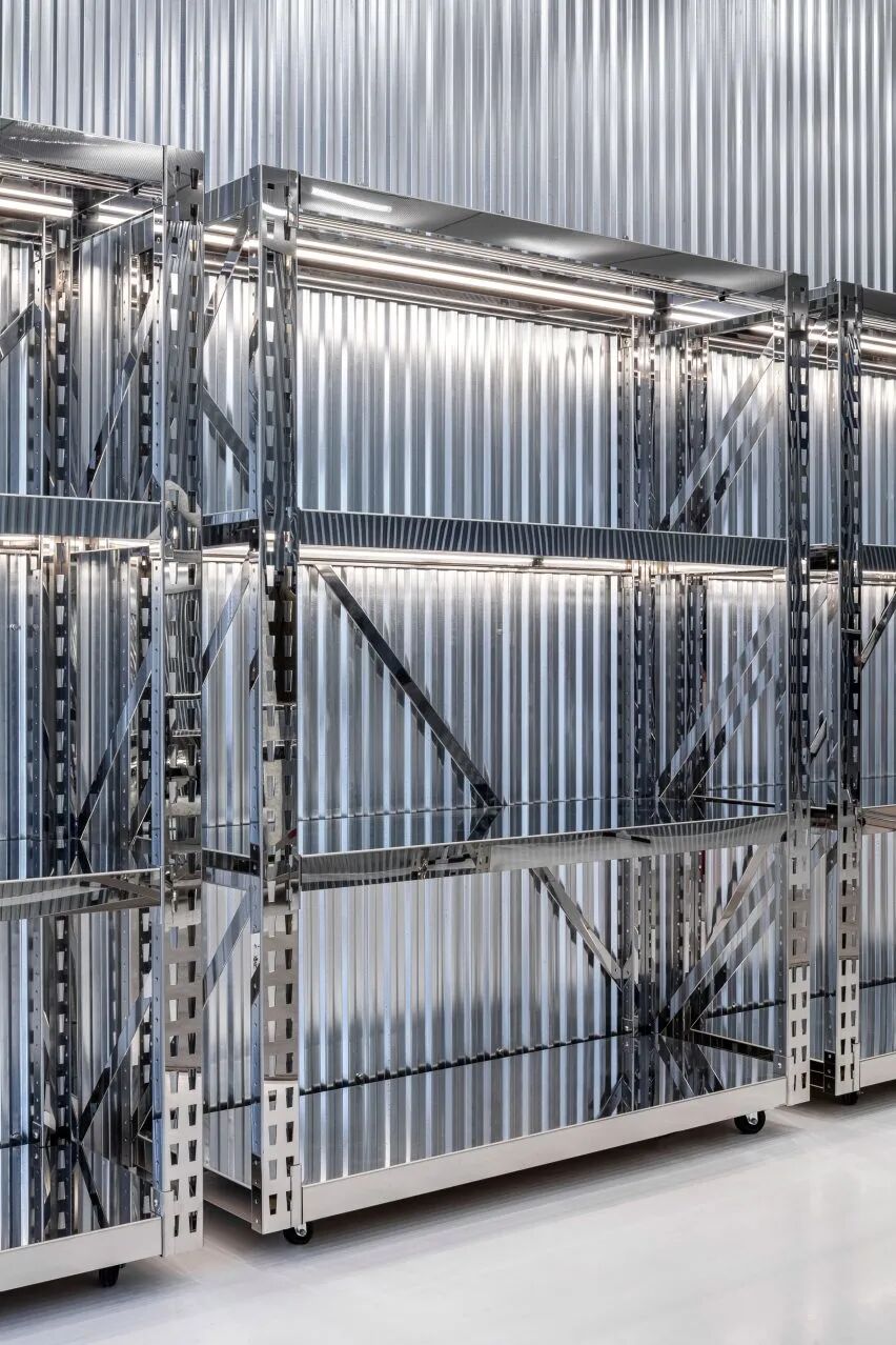 统一的不锈钢材料与天花板上格子灯光相映成趣,无论哪个角度都呈现出绝对的工业美感,为品牌价值的传递带来更多惊喜。