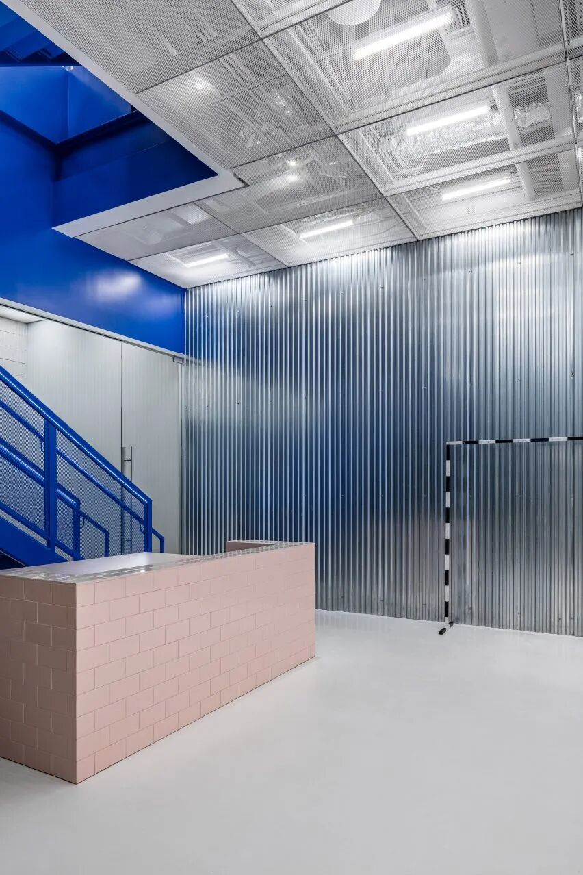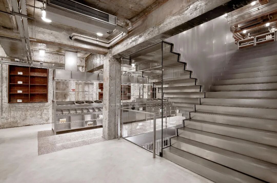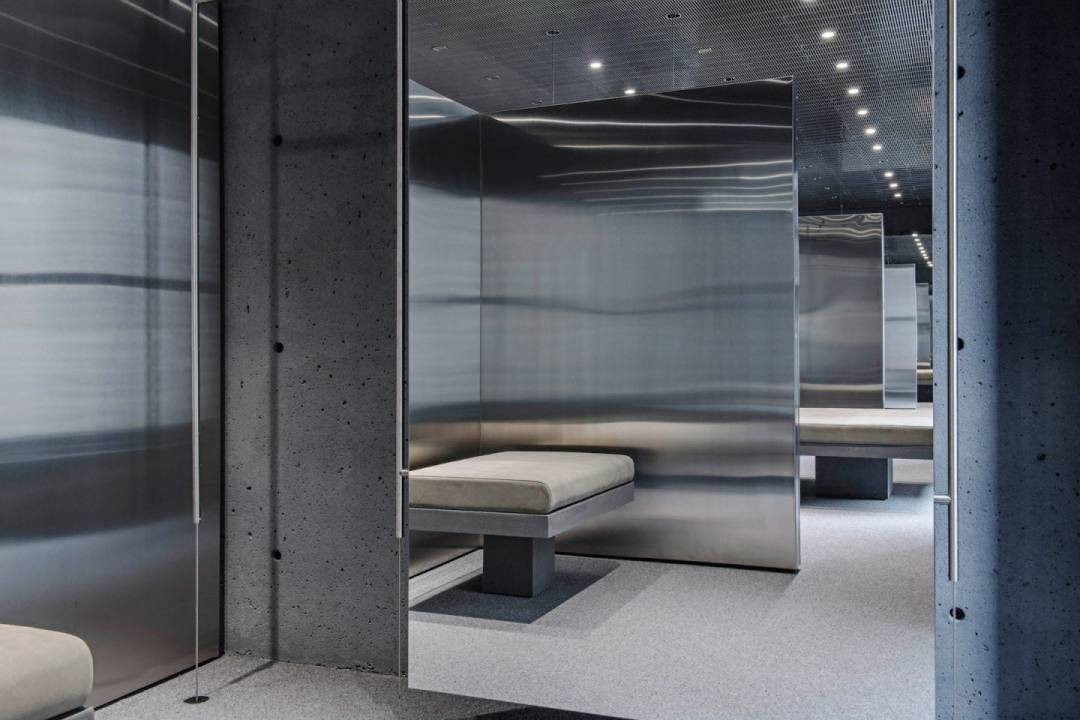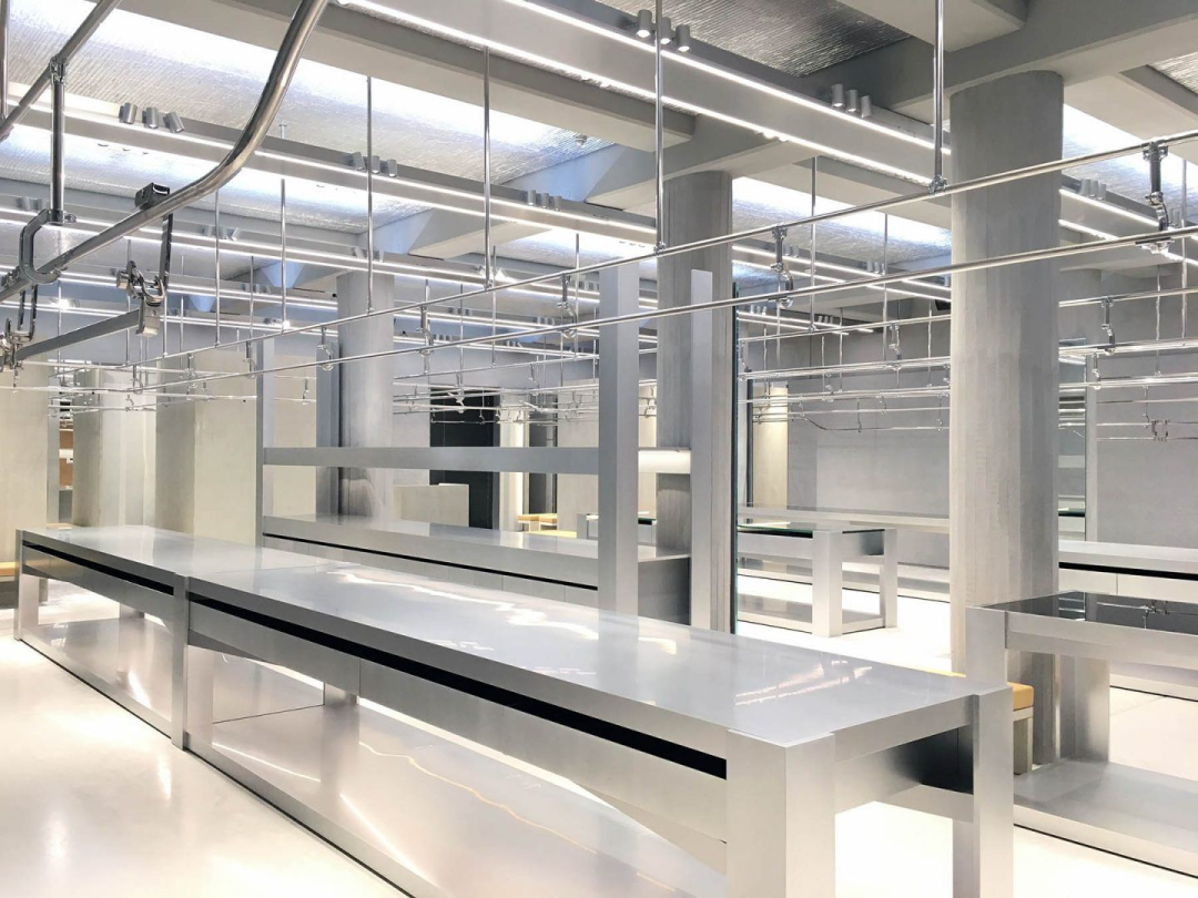 统一的不锈钢材料与天花板上格子灯光相映成趣,无论哪个角度都呈现出绝对的工业美感,为品牌价值的传递带来更多惊喜。
