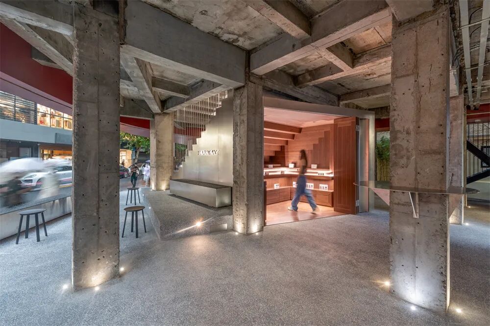 最近新火起来的零售店 in the Park ,在上海延平路也采取了“裸露柱子”的风格。AIM Architecture 重新诠释了上海城市肌理,呈现了生活、在地性及街区文化的融合,模糊了室内室外的界限。