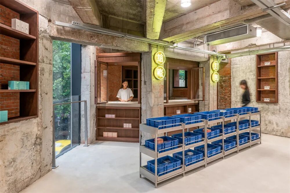 本案由AIM恺慕建筑设计操刀,将新的层次存在于旧建筑的四层高混凝土裸露「躯壳」之中,同时融入最能代表老上海的弄堂元素:结账区墙壁上醒目的圆形霓虹灯令人仿佛穿越回了旧时代。