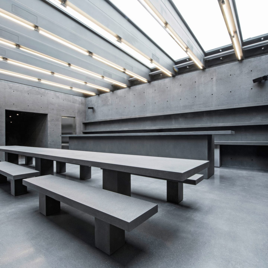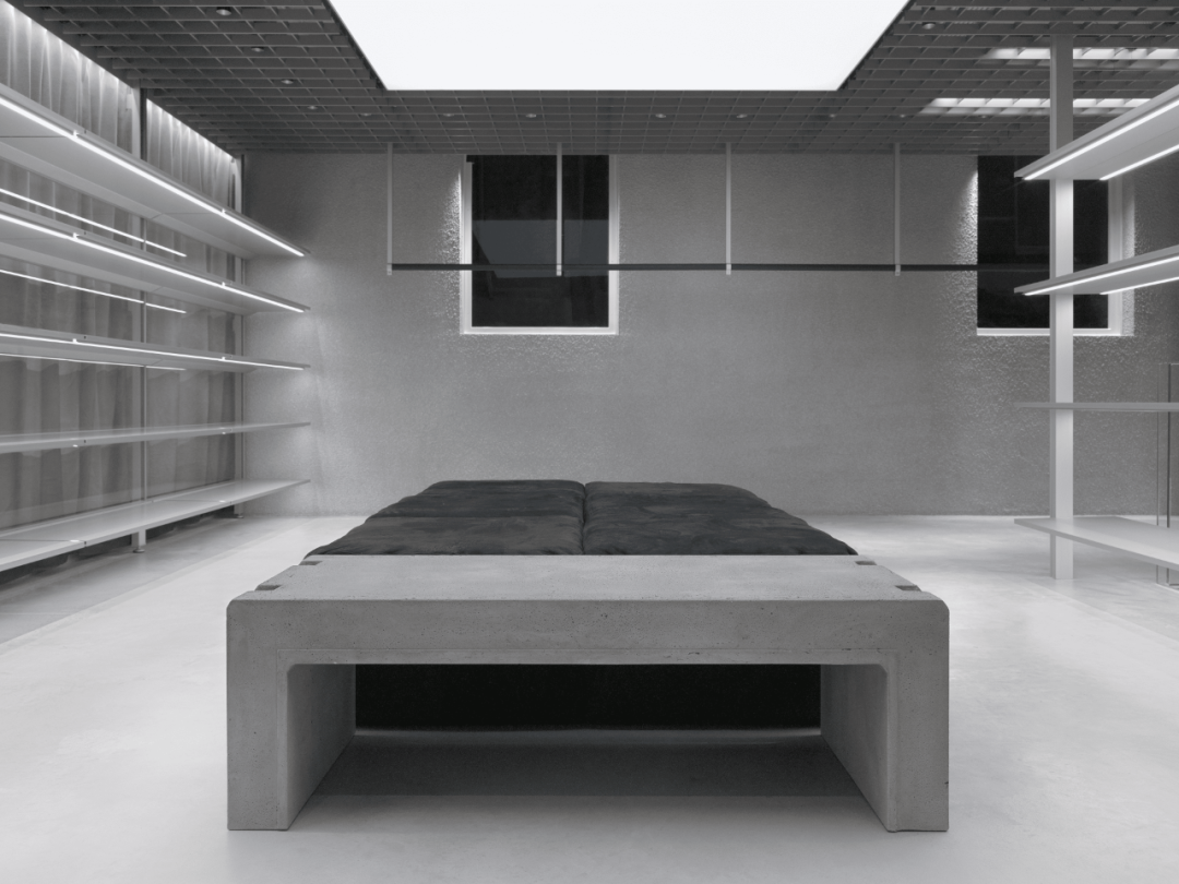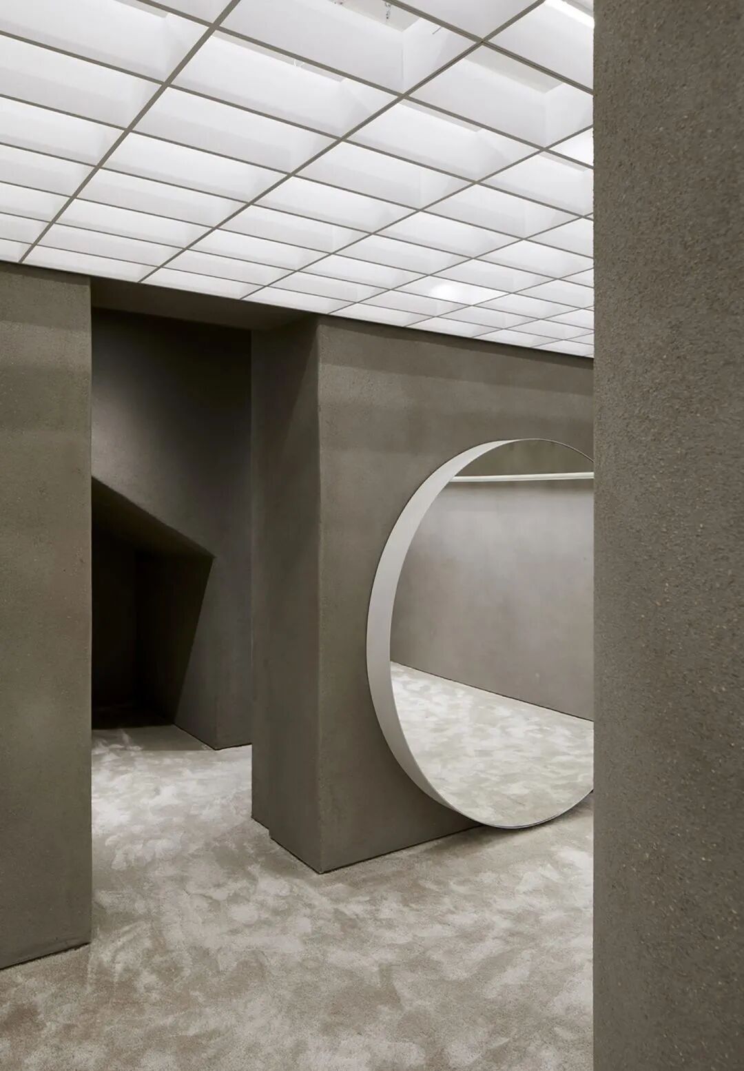说起同样的磨砂质感设计,在伦敦的Eytys品牌旗舰店,也邀请设计师 Shiro Kuramata创作了粗糙的灰褐色混泥土墙达到软化工业设计的目的,并使用长长的灯管以及镜面门,将品牌理念传达到店内的软装设计中。