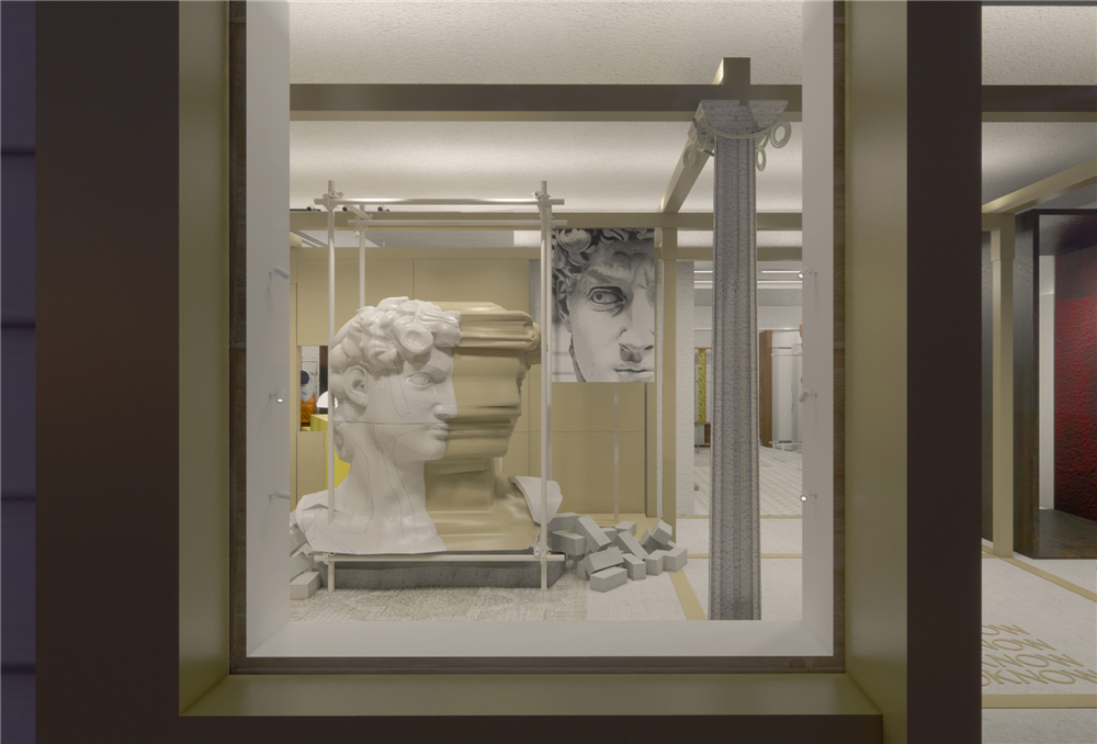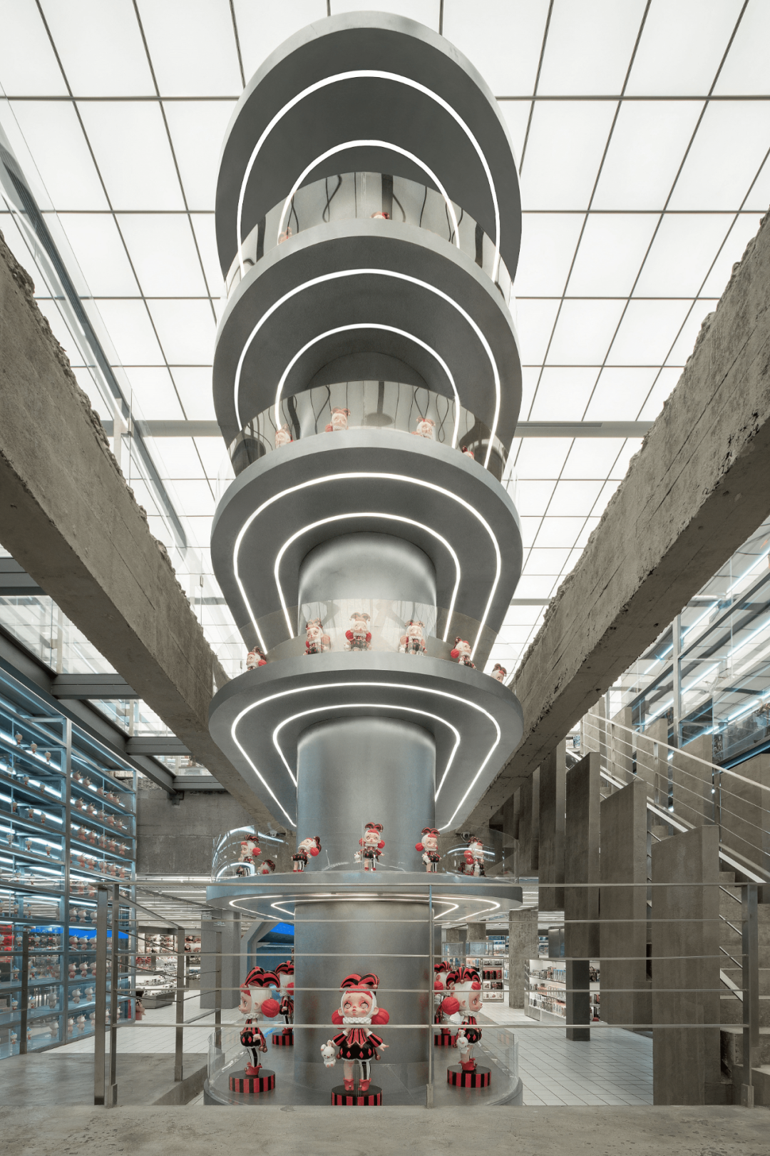 设计的理念是「X方舟」,体现在入口处一座 6 米高的通高货架——有三层钢结构做支撑,象征着末世方舟的概念。