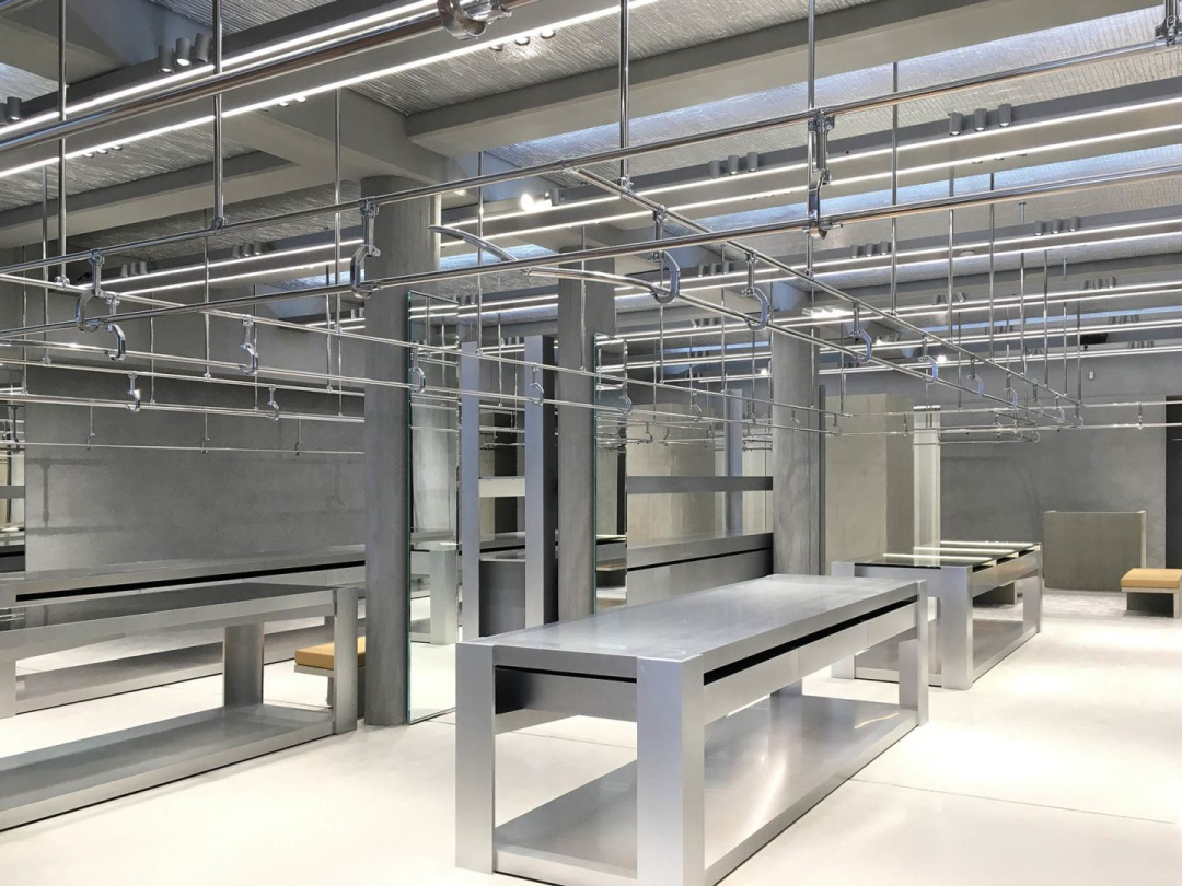 另外天花板上的反光铝箔薄膜,结合纵横交错的「挂衣杆」,使个零售空间瞬间充满冰冷工业感