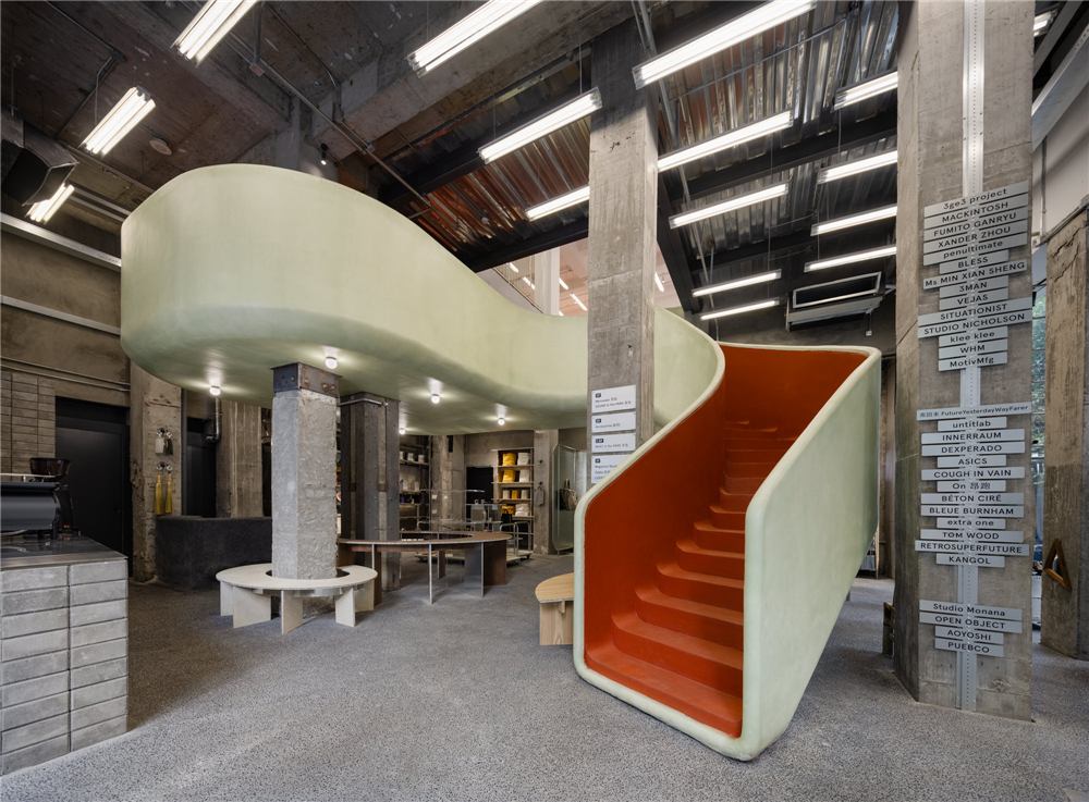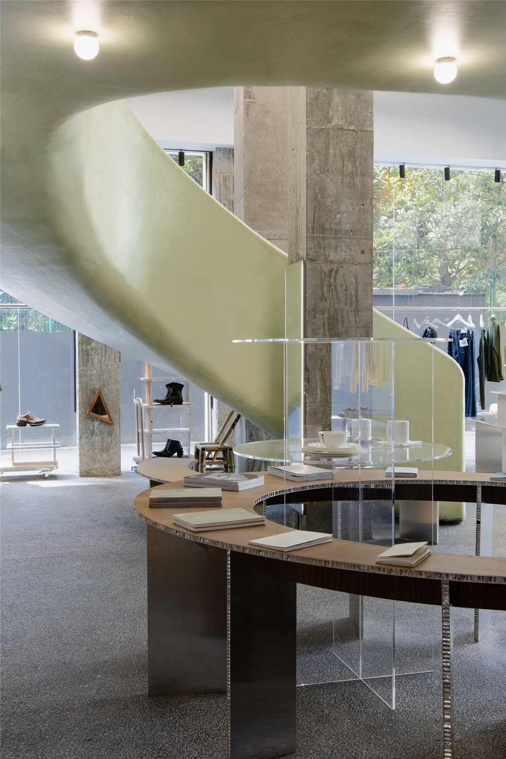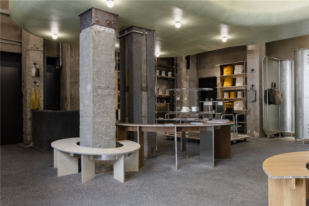 建筑内部,分为双层,转角的弧度与楼梯的水磨石地板相互抵消,光线随着建筑的缝隙微透出来,并通过不同的形状的物品,将空间达到一个有趣、温馨、高级的艺术零售环境。