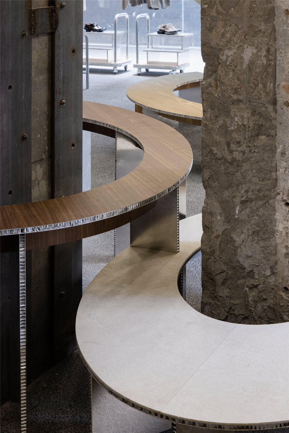 蜂窝铝板制成的置物架用料轻盈却非常坚固,表面附上木皮和石漆,增加了不少自然与工业的呼应。