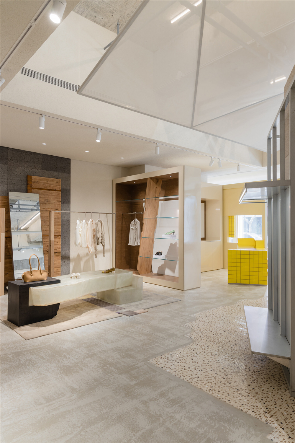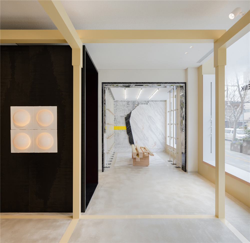 入口处的黄色框架代表展示区,前后串联偏现代的陈设与工业感的粗糙肌理。这里更是一个灵活的“空间物体”,为品牌搭建快闪空间、艺术装置提供更多便利。