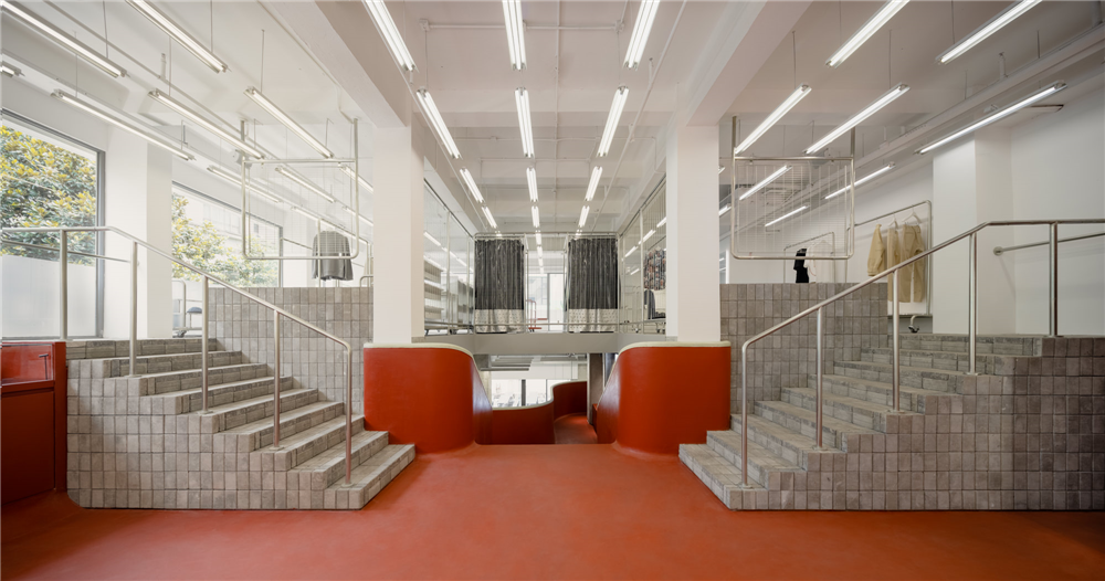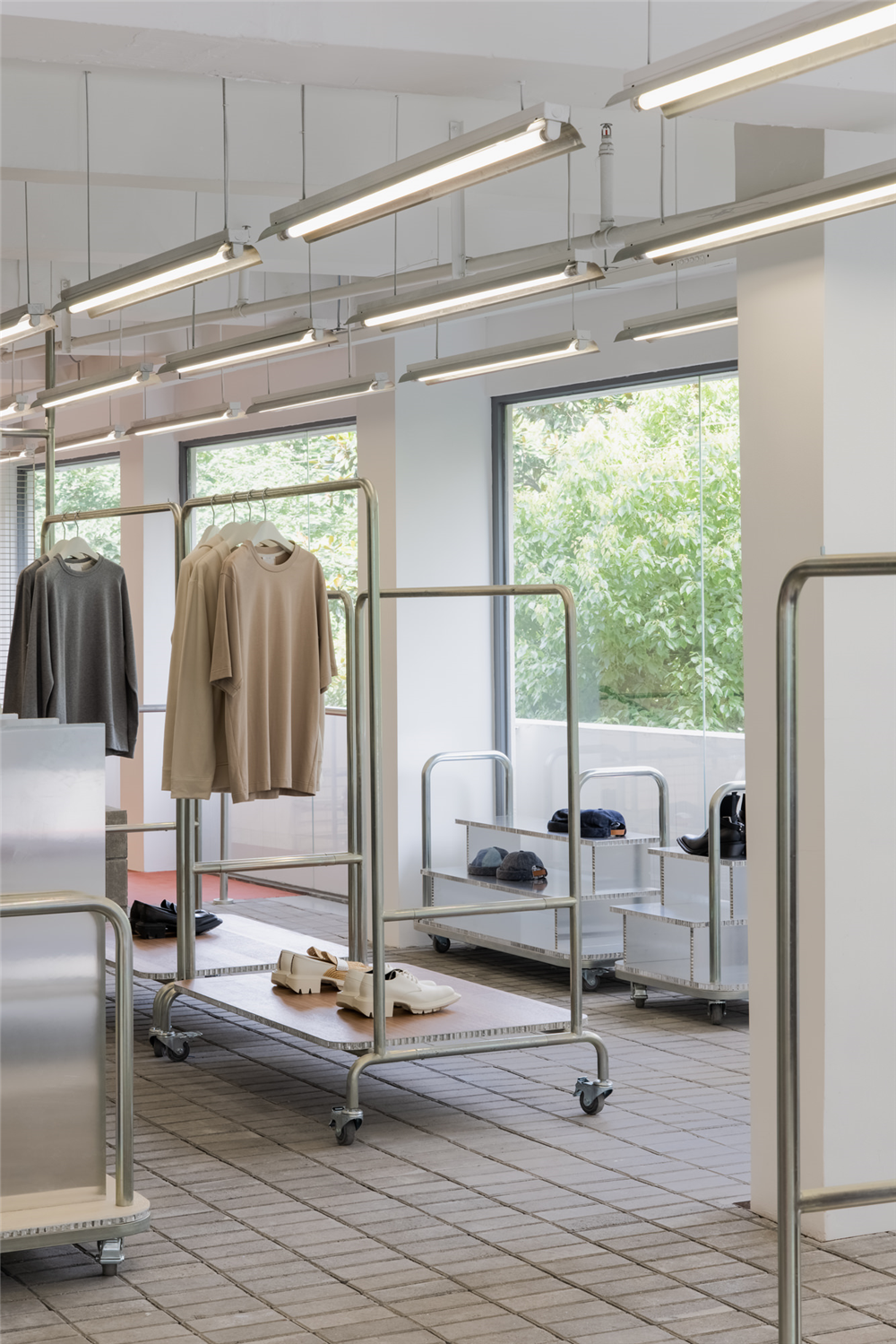 所有设计共同呈现出一种有趣的城市生活感:一种室内室外的颠倒和置换。不锈钢货架、行李架似的移动陈列架,打破了大众对于服装专柜的想象。
