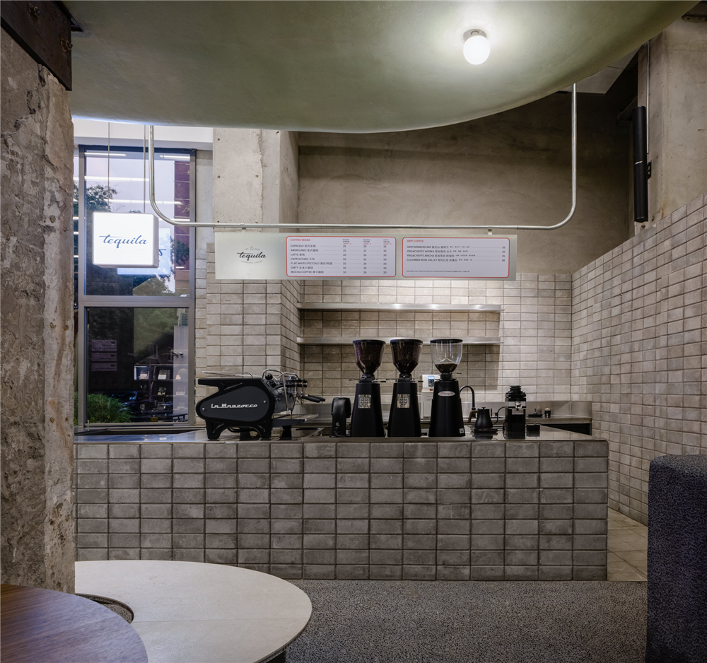 在顶楼上方设计的专属咖啡区,定制化的水泥长桌和三层L型墙面置物架,作为展台和货柜销售区。