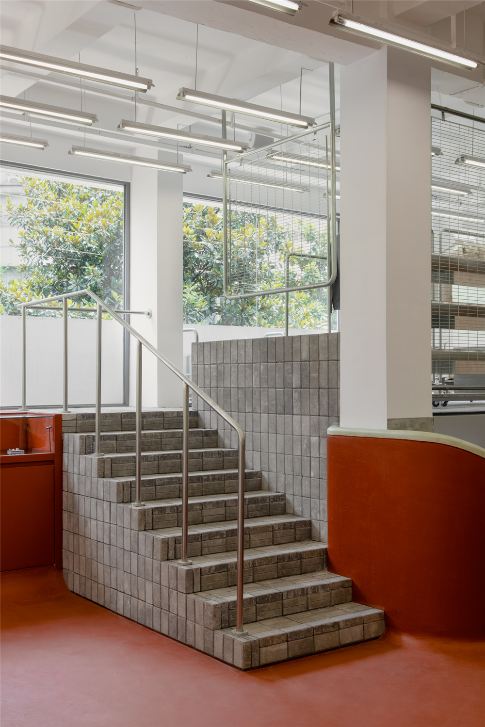 橡胶跑道色的滑梯、公园里常见的砖砌扶梯,是户外元素移植室内的巧妙转换。