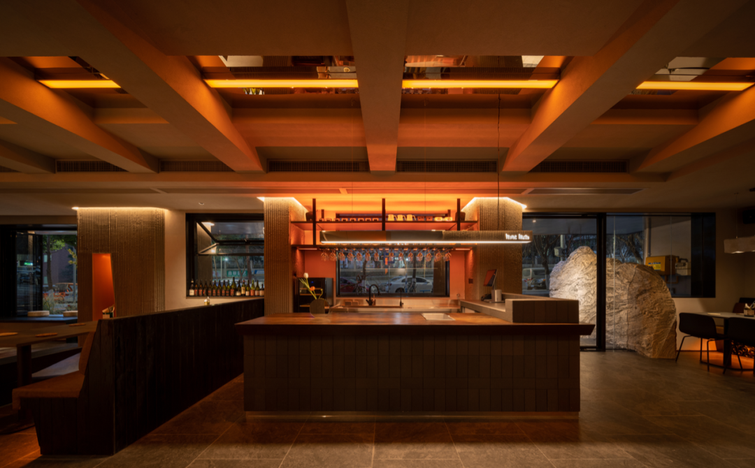 未韬建筑设计事务所以“原始·自然”作为设计的核心,用如同巨石阵的柱状石块,营造出原始粗旷的感觉。