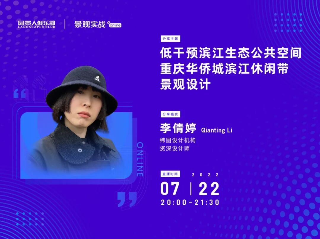 7月22日(周五)晚上20:00,纬图设计机构资深设计师李倩婷为大家带来景观实战online56讲分享,《低干预滨江生态公共空间——重庆华侨城滨江休闲带景观设计》!带大家一起走进华侨城滨江休闲带,看设计师如何进行景观升级。首播免费,回看付费39.9元!(俱乐部会员免费回看)