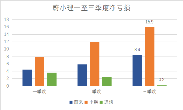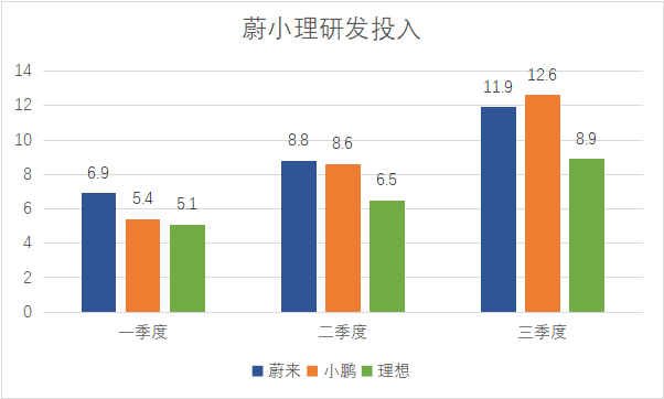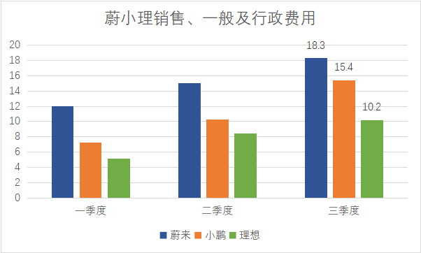 三季度蔚小理三家销售、一般及行政费用分别为18.3、15.4、10.2亿元。由于蔚来一直树立的高端服务形象,因此高昂的租金和人员费用使得其支出排名第一。