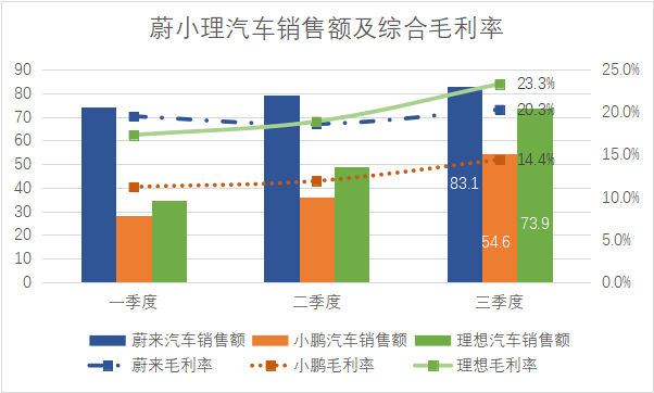 三季度蔚小理汽车销售额分别为83.1、54.6、73.9亿元,蔚来仍旧排名第一,理想小鹏分列二三。