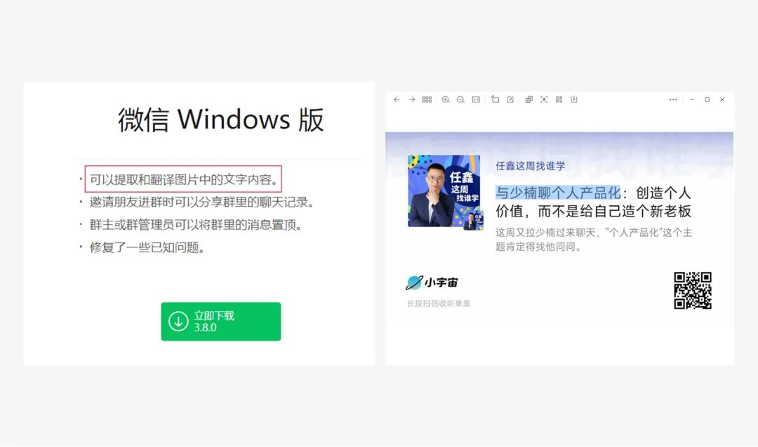 最新的「微信」PC版终于支持识别提取和翻译图片中的文字。当你点开任意一张带有文字的图片时,直接用鼠标点击文字部分即可选中内容;不仅省去了点击按钮才可识别文字这一步骤,降低了用户的操作成本,还方便用户在复制内容时直接选中相应的文字,减轻了用户在识别出来的文本中寻找相应内容的时间,比QQ的识别方便多了。这个功能虽然看似只是替用户减少了一两个步骤,但是起到的效果却是巨大的。