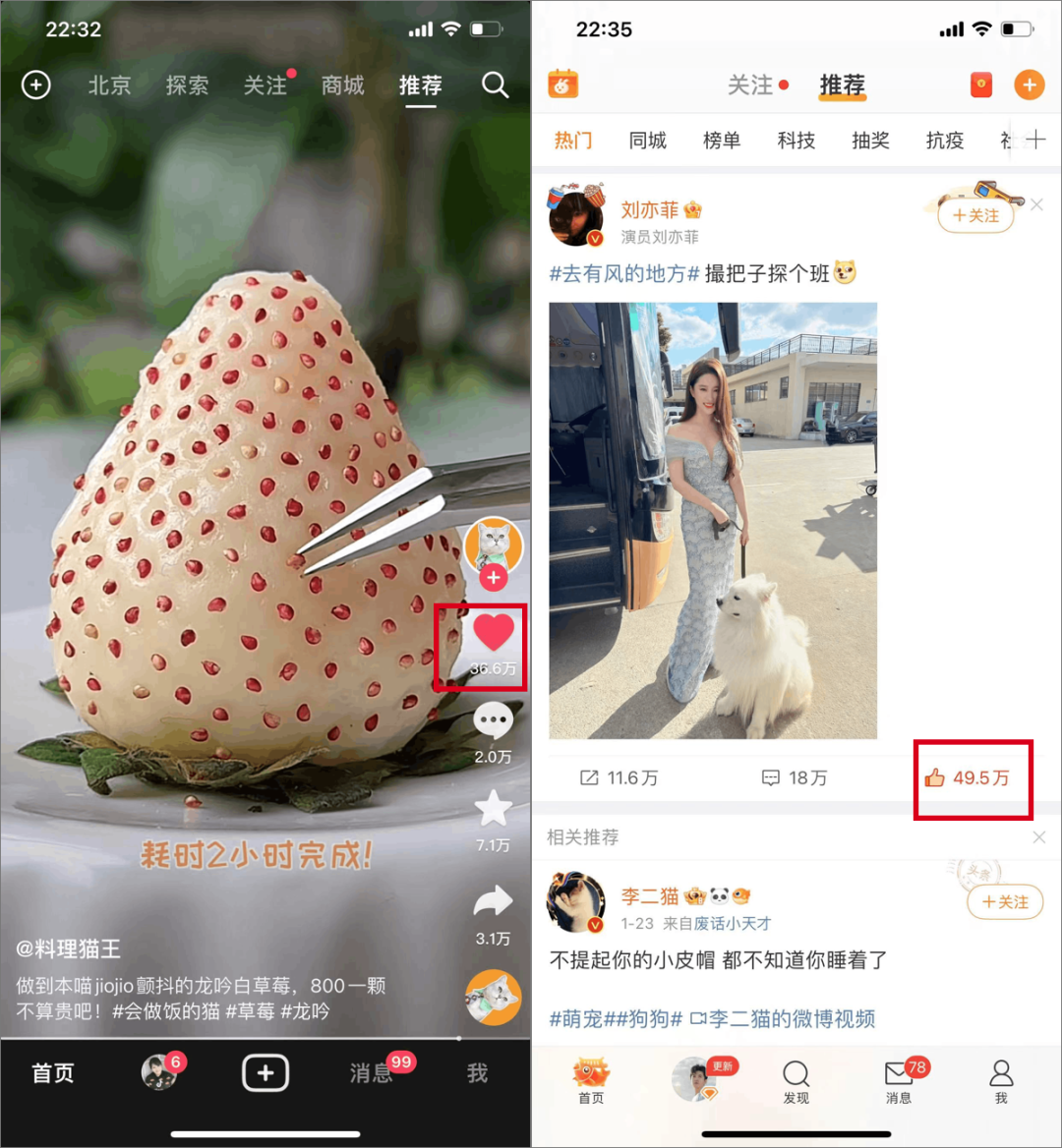 比如抖音和小红书,❤️代表点赞。而微博,👍🏻代表点赞。