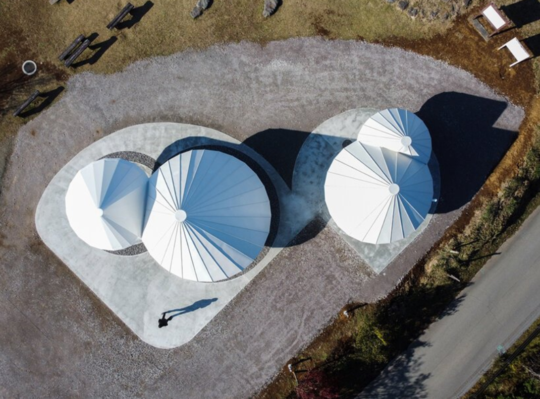 隈研吾事务所的建筑师通过屋顶定义了誓言山公园的休息区,简单的结构暗示着一个小山脉,披着一层半透明的白色皮肤,让人想起白天白雪皑皑的山峰和夜晚发光的灯塔。