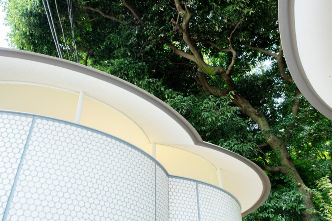 位于通往代代木八幡神社的一段台阶脚下,伊东希望营造出蘑菇与背景森林相协调的印象。为了实现这一点,三个体量都覆盖着从深棕色到浅米色的小圆形瓷砖,厕所的顶部还有与蘑菇帽相呼应的圆顶屋顶。