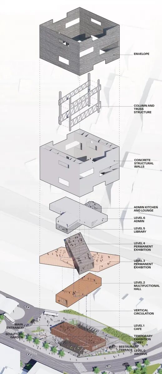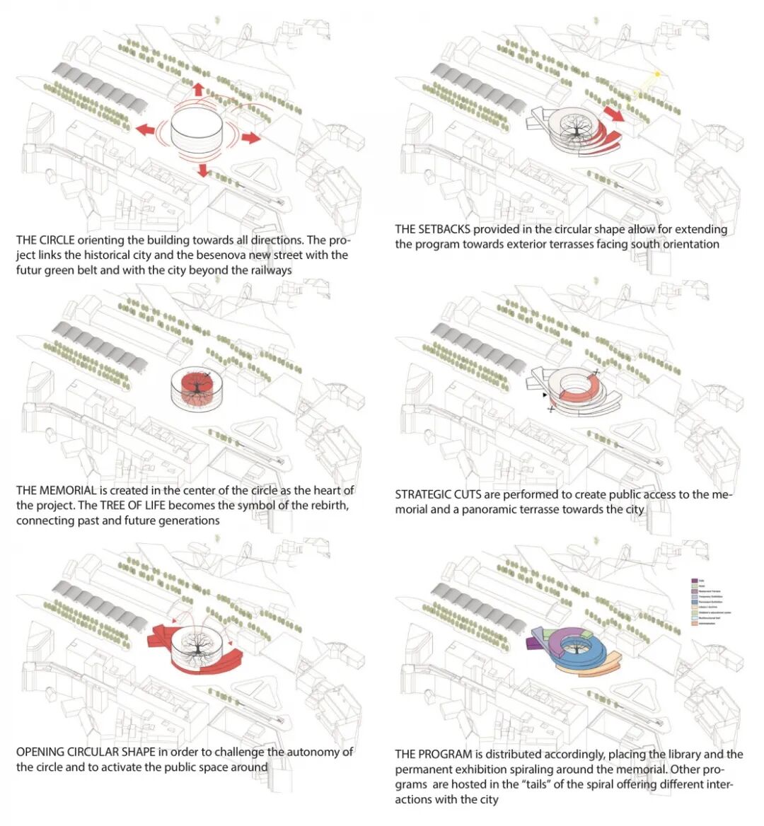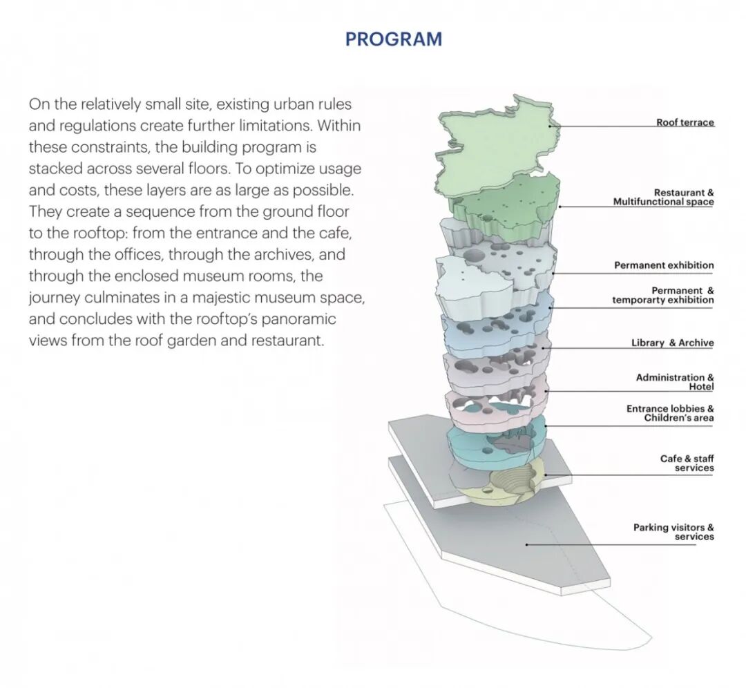 隈研吾事务所的设计采用了现代和抽象的风格,巧妙的利用了犹太文化中的主要标志“圆圈符号”,以螺旋运动的形式留出了一个被包围的内庭院,并种植了一棵橡树。项目的不同功能也围绕着“生命之树”徐徐展开,共享大堂、图书馆、展览馆、全景露台...这使游客直观地感受到犹太文化的多样性和复杂性。