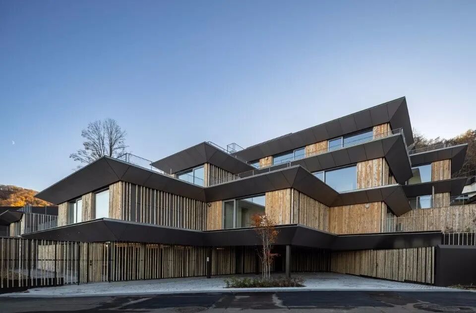 外墙和挡土墙覆盖着当地采购的原木,团队为了将木材和混凝土结合起来,使用带有粗糙树皮的原木板作混凝土的固定模板。建筑包含15个单元,每个单元内部设有一个大型睡眠区、带桑拿浴室的套间浴室和厨房,可以通过中央室外楼梯进入每个单元。