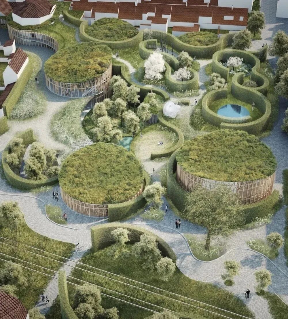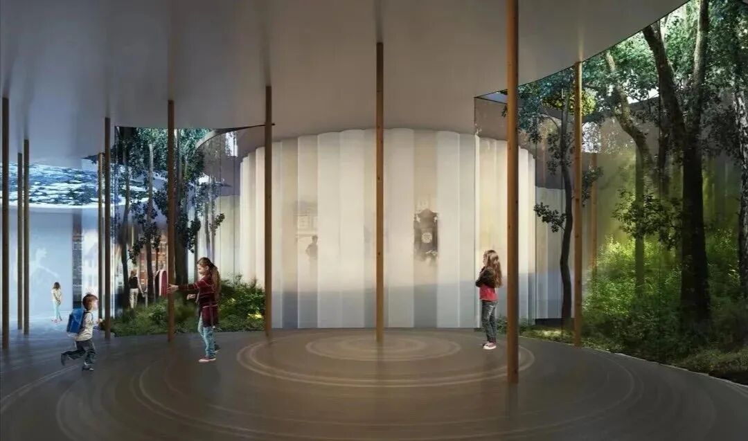 博物馆由一系列圆柱结构组成,木质柱子就像森林中的树干;透过玻璃幕墙,可以与外部自然环境“对话”,也可以感受不同光线带来的空间变化体验;略微凹入的屋顶是为了容纳空中花园,所有绿色元素无一不在强调“自然”与“可持续”。 这种设计不仅将现代建筑、自然和童话巧妙结合,更是提醒人们“探索自我和外界的关系”。