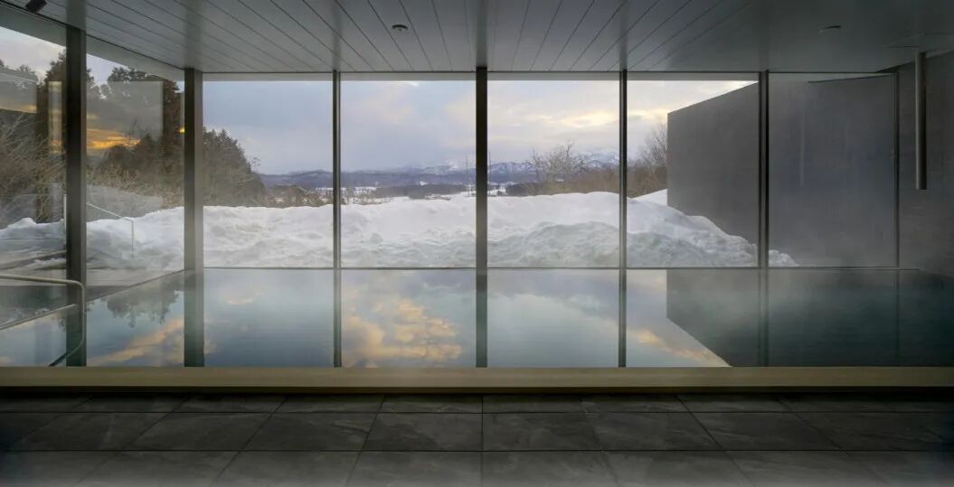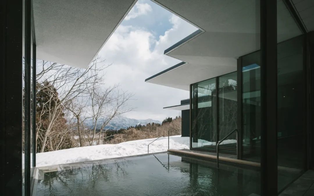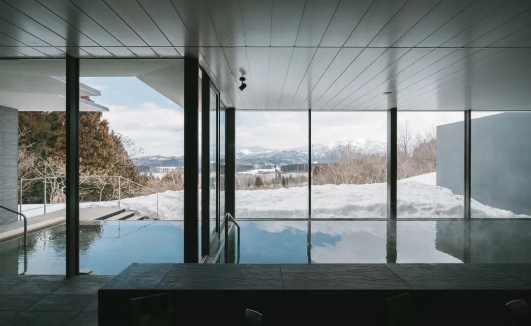 室内浴池透过大片的落地窗,让目之所及皆是山河风光。