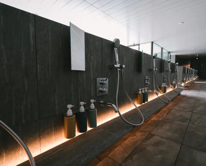 桑拿区还在中心位置设置了 360 度的环绕加热器,和专为该区域开发定制人造石「Kerques Stone」,据说「Kerques Stone」具有很高的远红外效果,可以温暖桑拿使用者的身体核心,享受像篝火包围的感觉