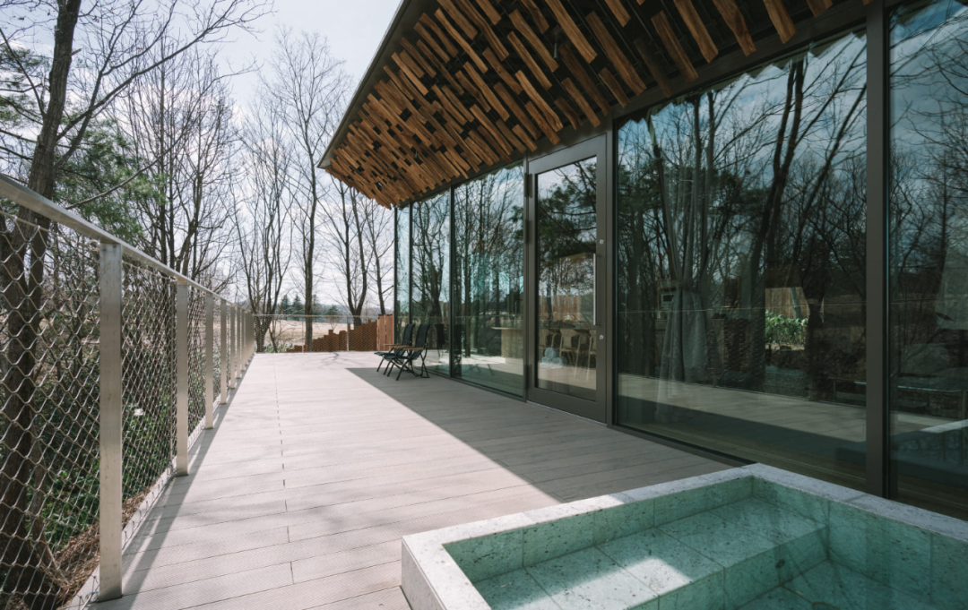 桑拿区有开放式露天浴池和室内浴池,为了获得与自然的一体感,室内浴池采用全景玻璃窗,还设有露台。