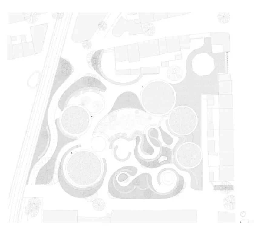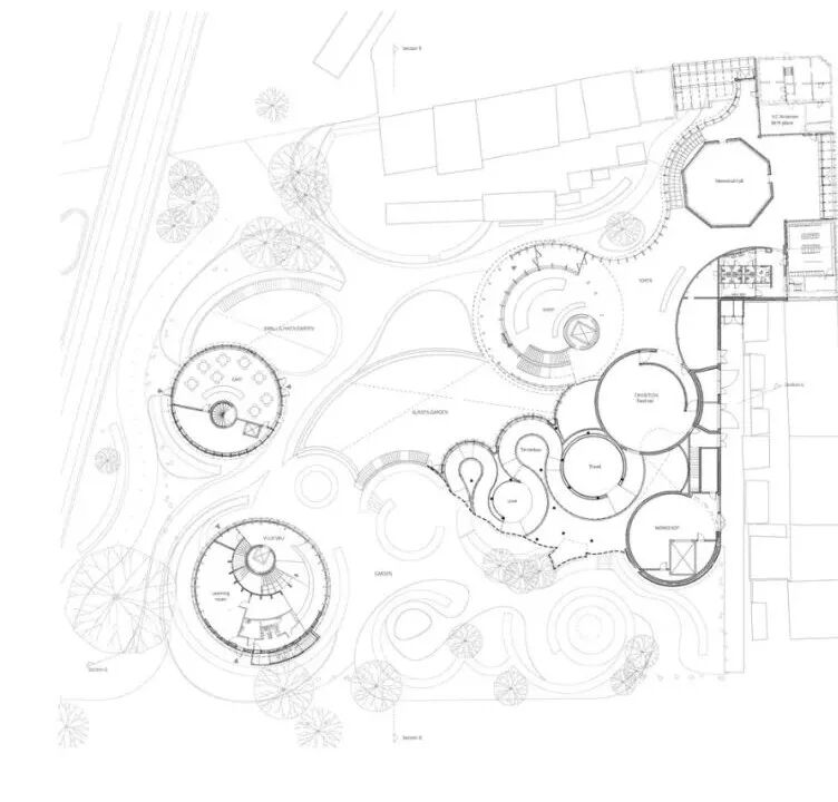 花园区域曲折蜿蜒的路径有如博物馆的延伸,在这里,实体的建造形式被弱化,来访者则被带入由植物和叶片创造的“迷宫”之中。