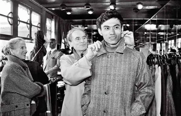 1981年,北京,法国设计师皮尔·卡丹在天坛公园的精品卡丹开幕式期间,为了让一名中国顾客更显英俊,帮助他整理衣领。