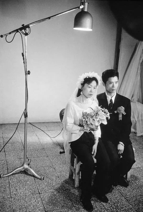 1980年,北京,在照相馆拍摄结婚照的夫妇。为了节省开支,新娘选择了只有上半身的婚纱。