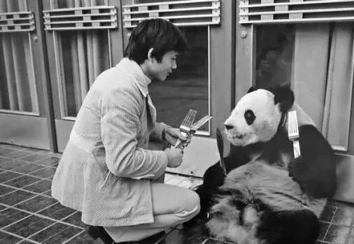 1978年,上海杂技团,熊猫卫卫和它的驯兽员罗新奇(音)。卫卫的节目是在舞台上表演用刀叉吃糖。卫卫表演得越多,吃到的糖也就越多。