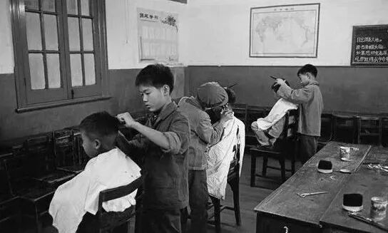 1977年,上海,小学生正在班级理发店里为彼此理发。当年,中国恢复了高考制度。