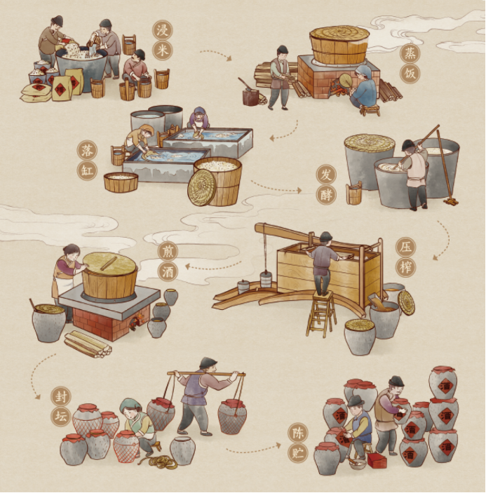 黄酒工艺复杂,通常选择在冬天酿造,因为这段时间鉴湖水体清冽,气候湿冷,此时投料可有效抑制杂菌繁育,确保发酵顺利进行,成酒风味醇厚柔和。这就是人们常说的“冬酿”。 曾玥/绘