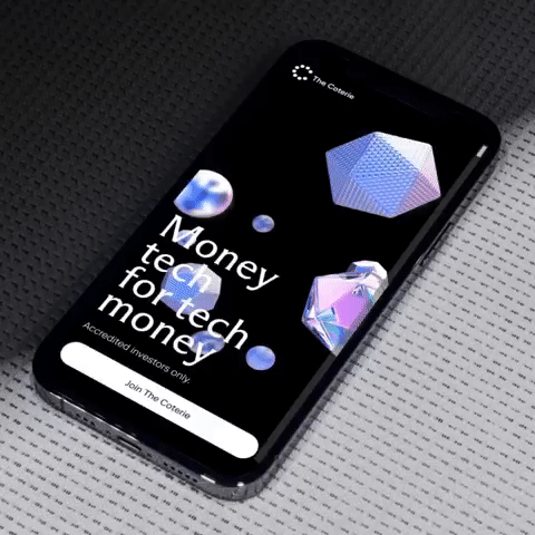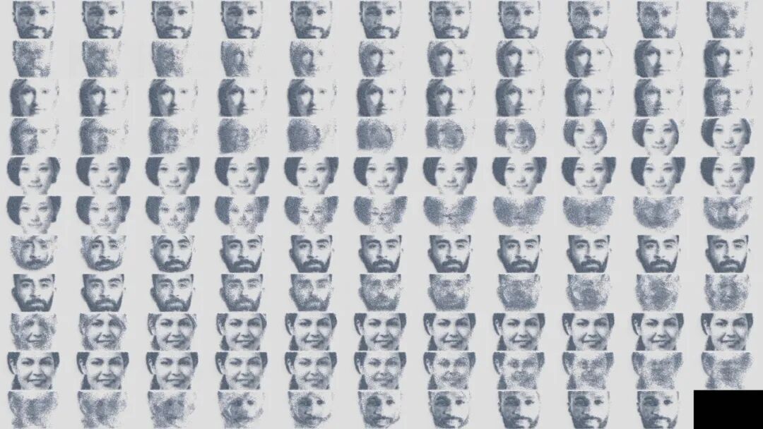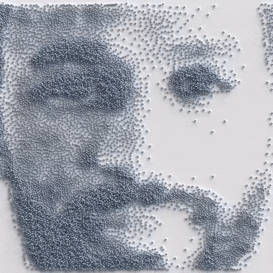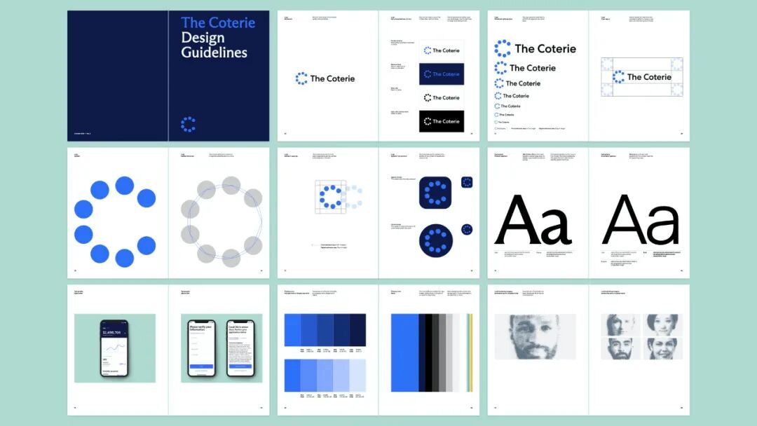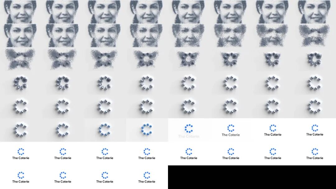 另外一个关于视觉语言的关键应用是呈现代表The Coterie成员的肖像。这个想法源于华尔街日报使用的熟悉的圆点肖像。Pentagram 与 Robert Hodgin 和Rare Volume的团队合作,在三维空间中用铬球创建成员肖像,每幅肖像由 12000 个球体组成,从一个球体平滑过渡到另一个球体,以 Coterie 图标结束。