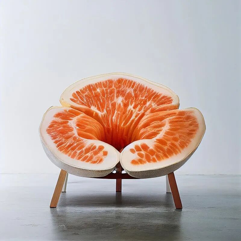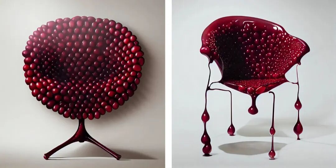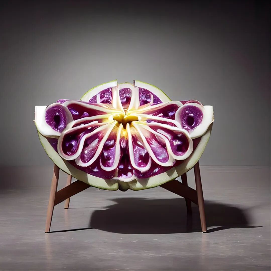 Frank Jacobus使用Midjourney,探索新兴的人工智能技术如何设想新形式的混合和异花授粉,在这个系列中,他通过各种超现实的形式、形状和纹理探索水果和家具的混合体。