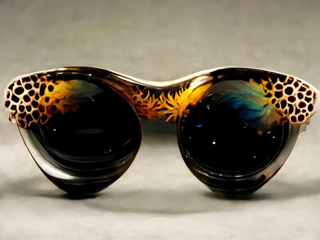 在Filippo Nassetti 使用AI工具Midjourney,全新视觉探索中,融合了自然和人工元素,创造了一个超现实的生物形态眼镜系列—— AI Eyewear 系列。这些作品由不同的自然形式组成,生物和矿物微观结构、纤维结构、生物岩石增生、铁磁流体、腐蚀金属等中的图案和纹理。