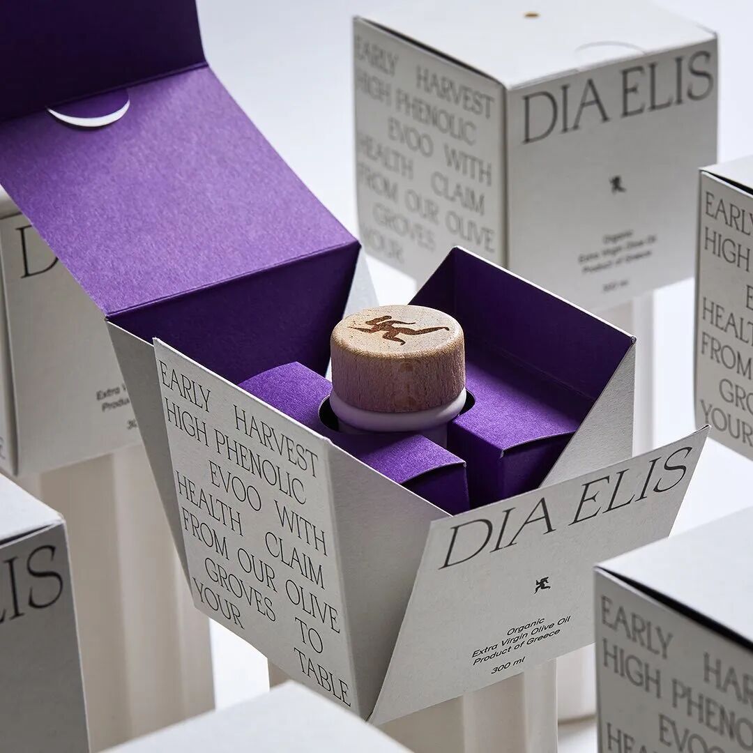 文字排版使用纤细的衬线字体,就像一首希腊诗印在盒子的一个面板上,而另一张则标注 Dia Elis 油的高酚含量。