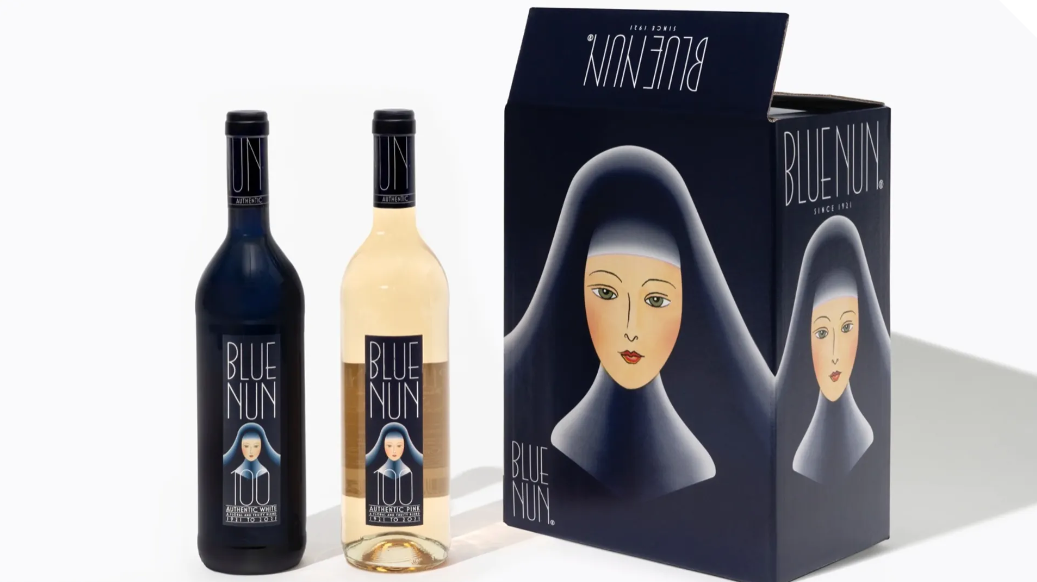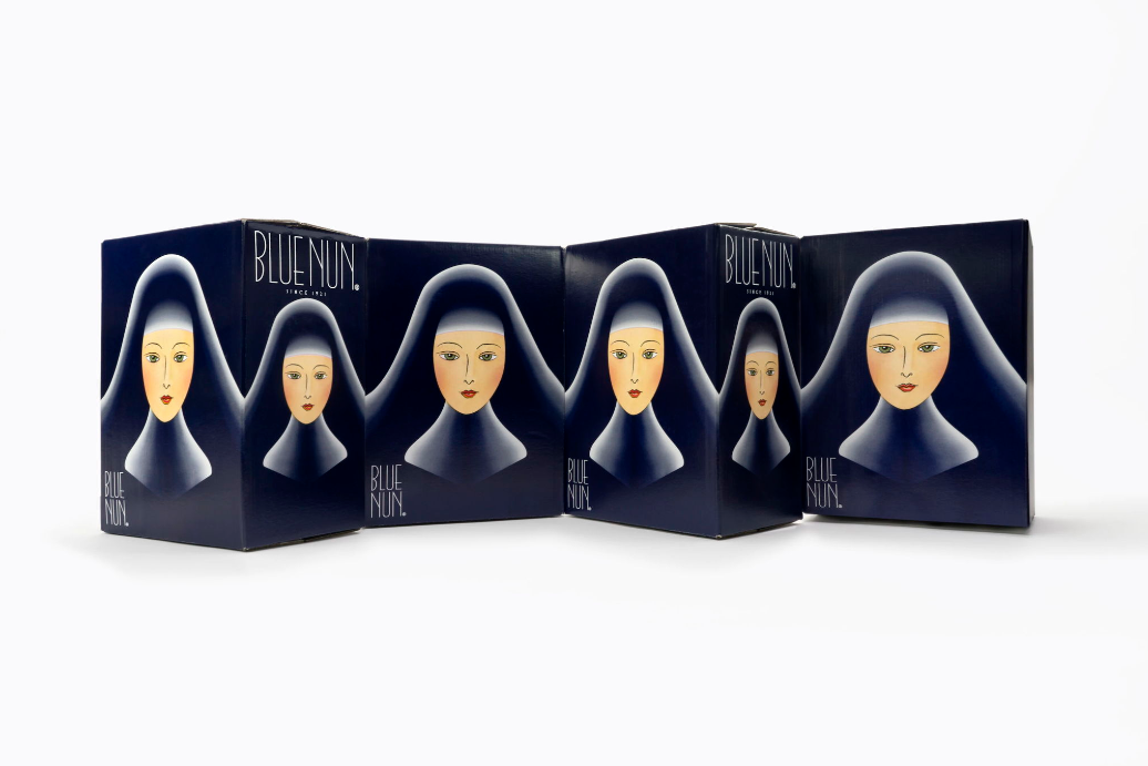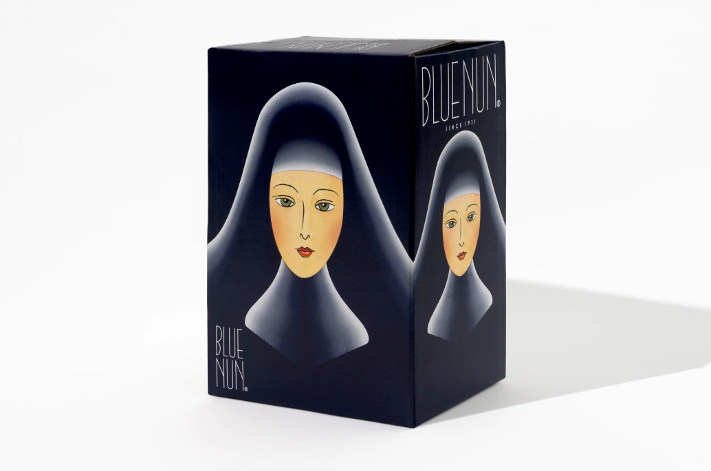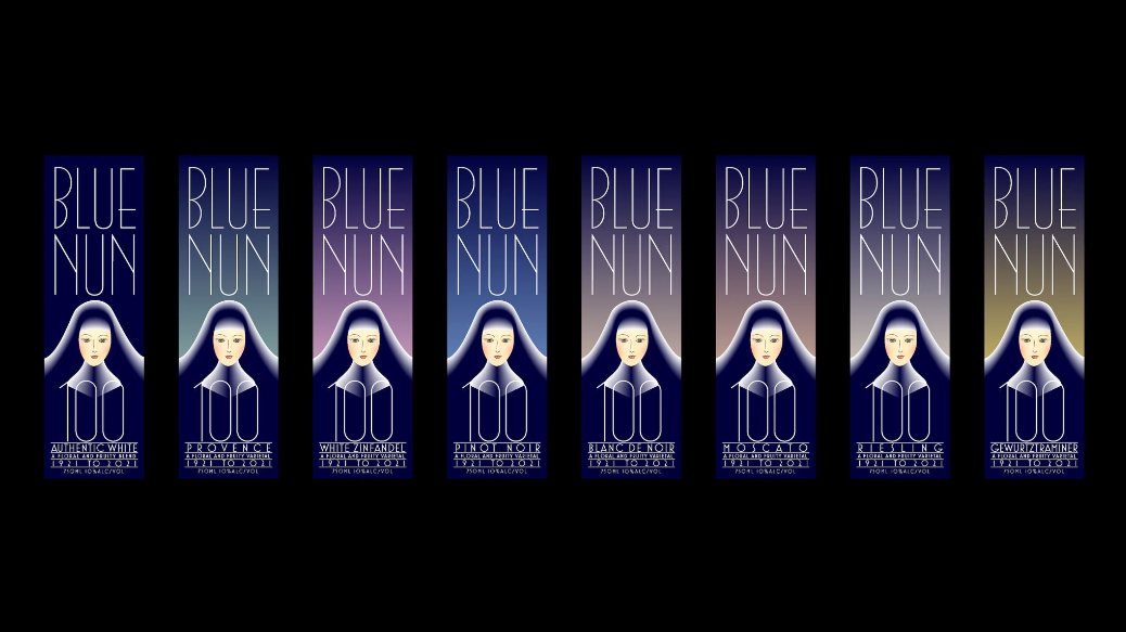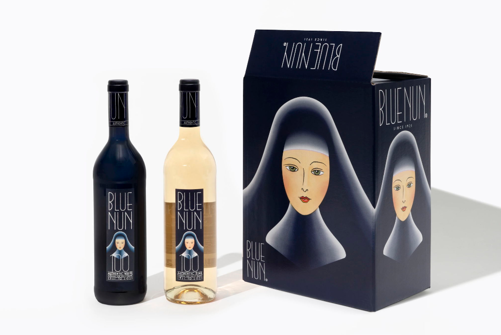 通过考古发现,Blue Nun最初的标签图片描绘了 18 世纪的修女在葡萄园采摘葡萄,此次100周年,设计团队想要释放品牌灿烂咆哮二十年代,展现它活泼、放纵的精神,所以他们选择对修女进行彻底改造.。