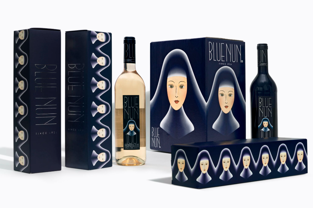 最近,为庆祝Blue Nun成立 100 周年,Pentagram 合作伙伴 Paula Scher 为其设计了俏皮的新包装,重新定义和构思 Blue Nun 在市场和社会中鲜明角色。