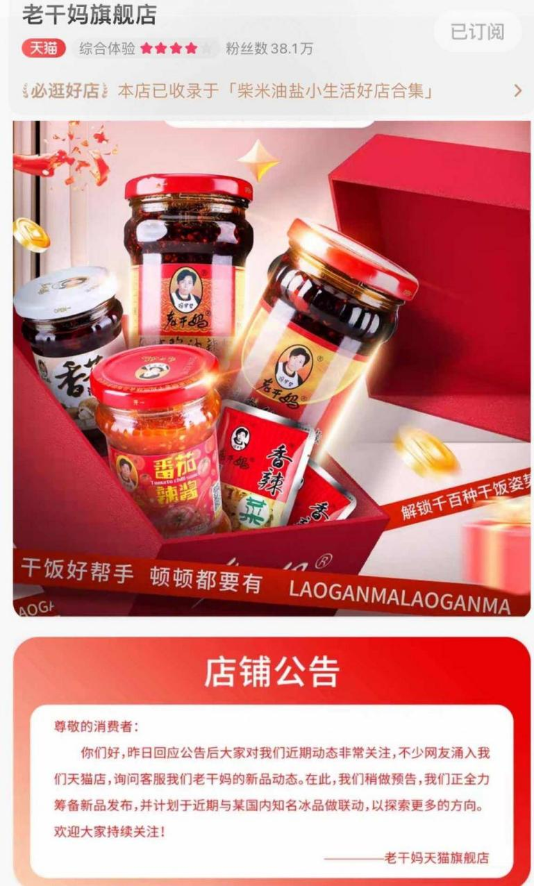 老干妈天猫旗舰店近日发布公告称: