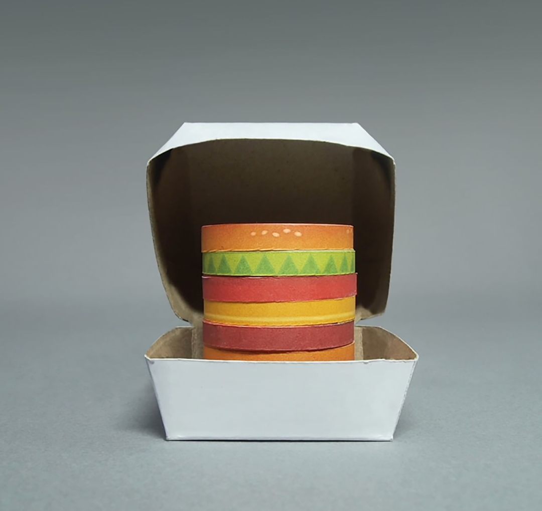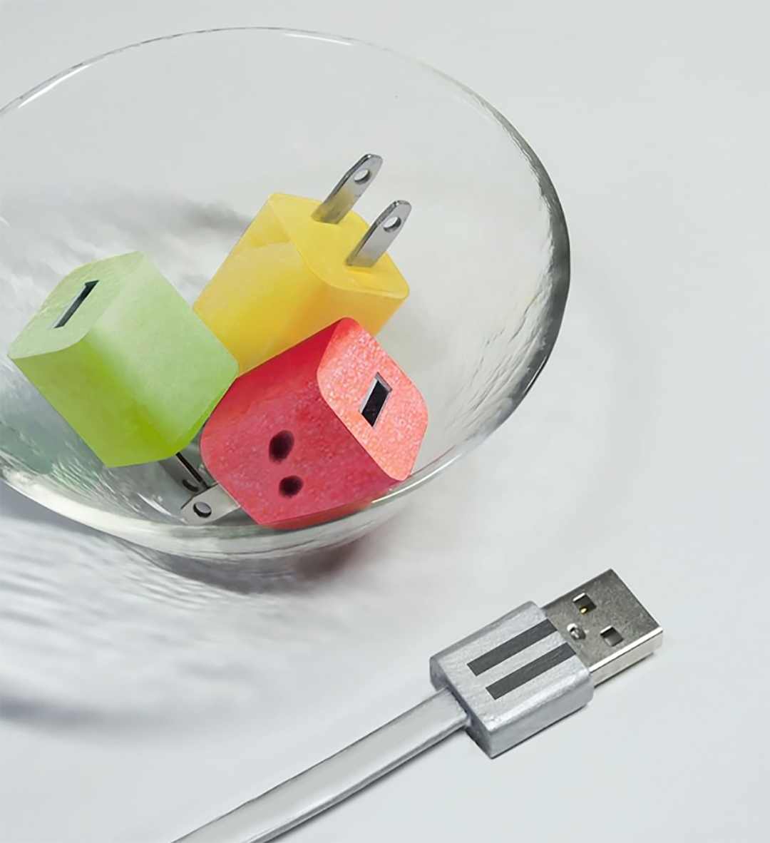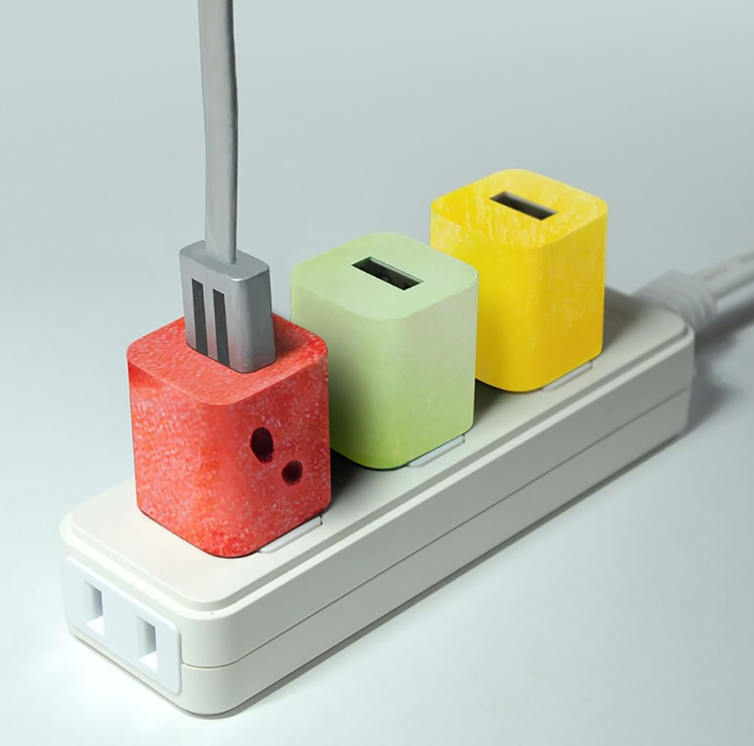 比如冰山纸巾盒、大阪烧铅笔刀、西瓜调味罐 、水果充电插头、USB 线披萨修正胶带、滚轮修正胶带、芒果数字小键盘、汉堡胶带套装、萝卜胶带、书皮+书签即可变身一把中国菜刀。