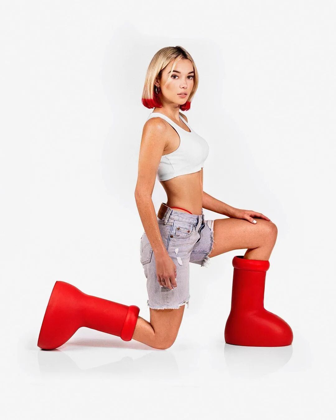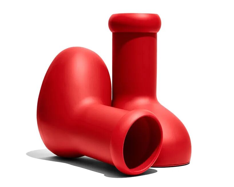 MSCHF 的大红靴的设计完全与细致工艺反其道而行,取而代之的是抽象的卡通形象。