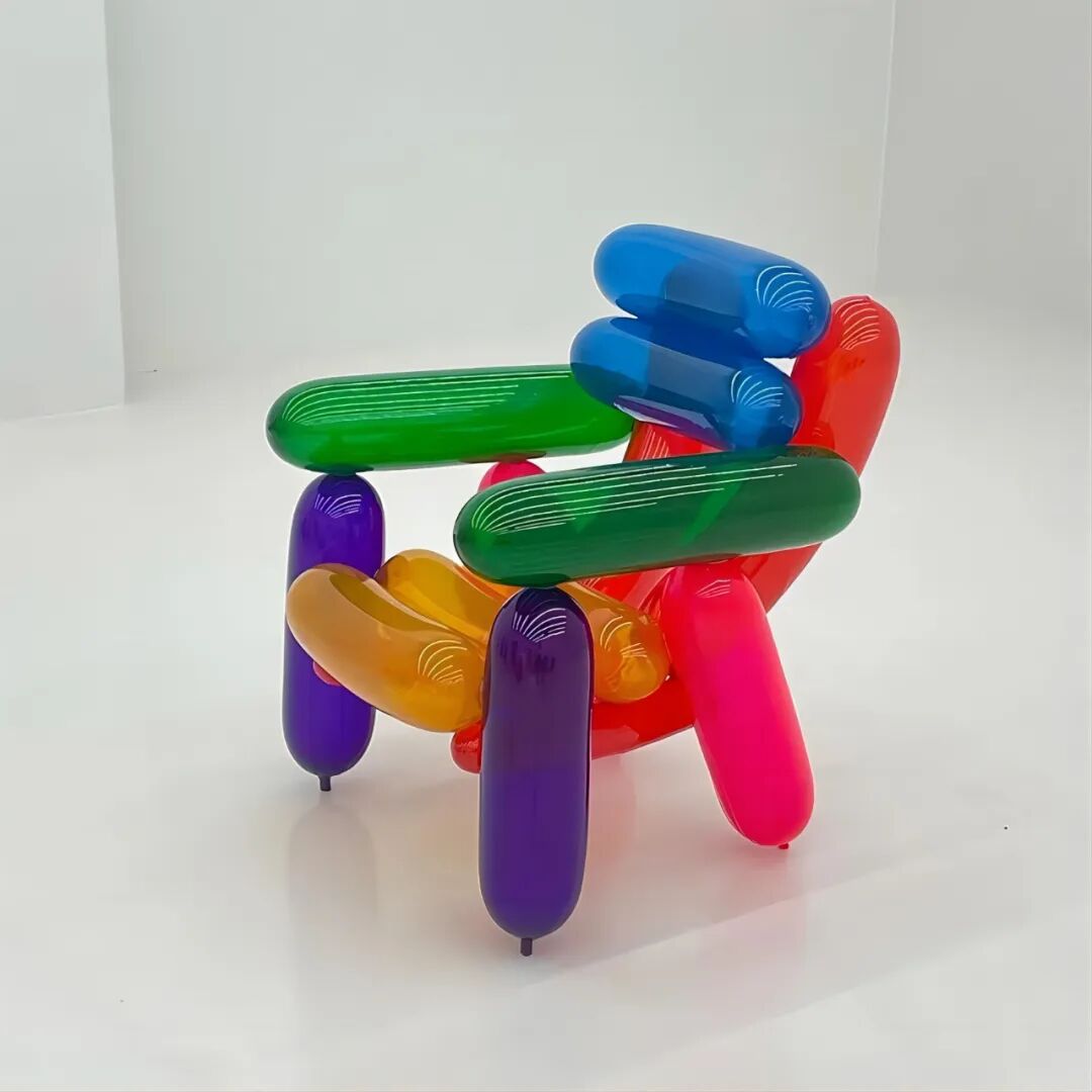首先将气球充气,形成所需的形状和尺寸,然后将它们固定成所需的椅子形状。一旦达到理想的配置,便彩色环氧树脂倒在上面并重复这个过程几次。为了使这种脆弱的材料足够坚固以支撑重量,需要多层树脂。当所有的元素都凝固后,这件作品最终组装起来,然后最后一次浸入树脂中。通过这种方式,它变得防爆、坚硬和坚固,足以用作座椅。