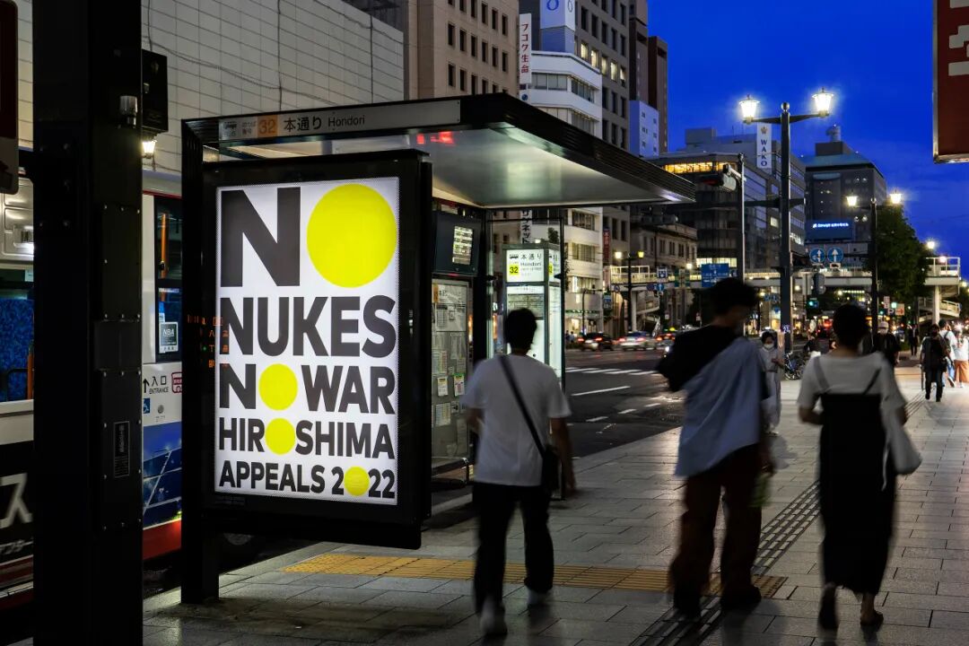 佐藤可士和设计此次“广岛呼吁”的海报,海报上的文字“没有核武器,没有战争,广岛呼吁 2022”构成了主要视觉效果以动态字母和数字为特色的设计。