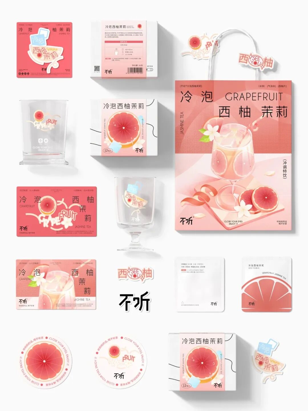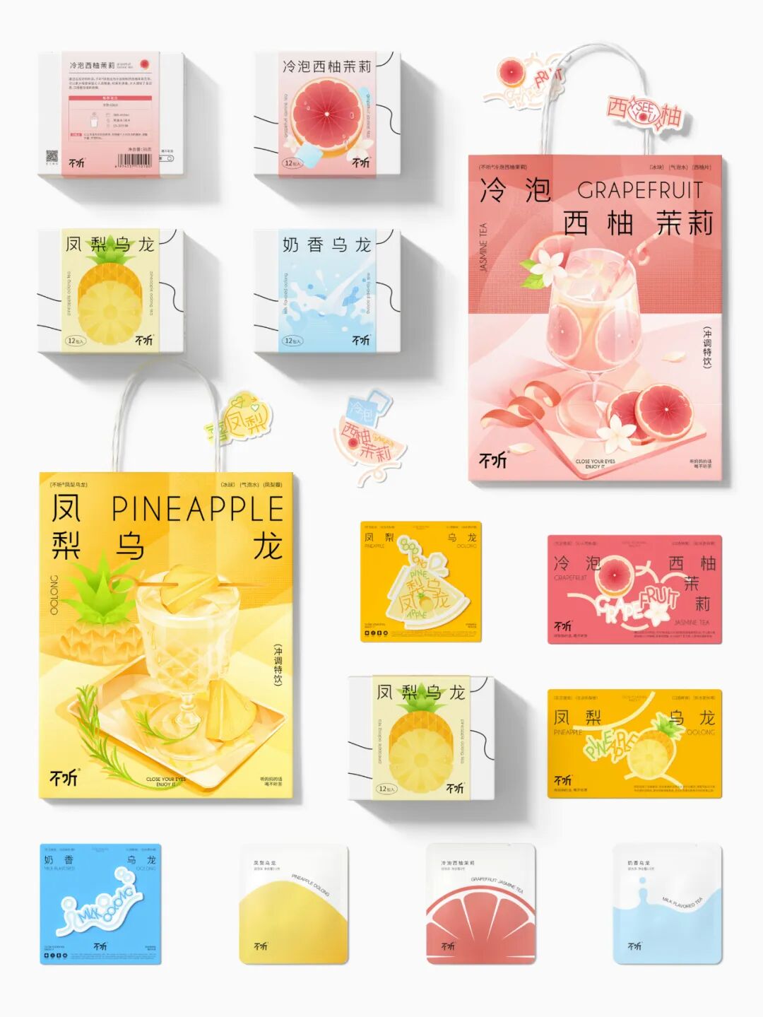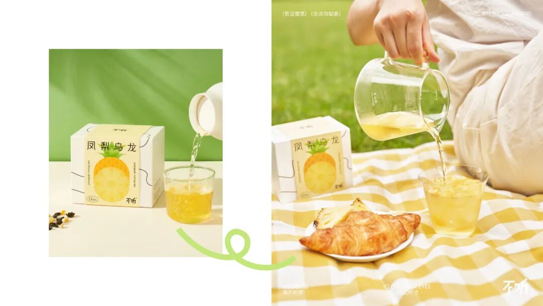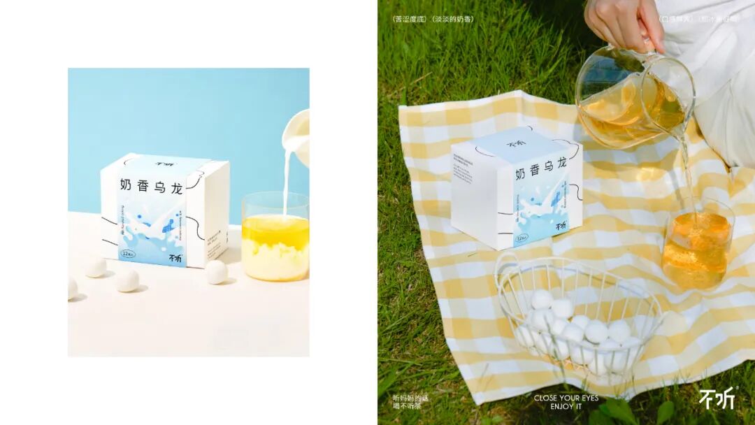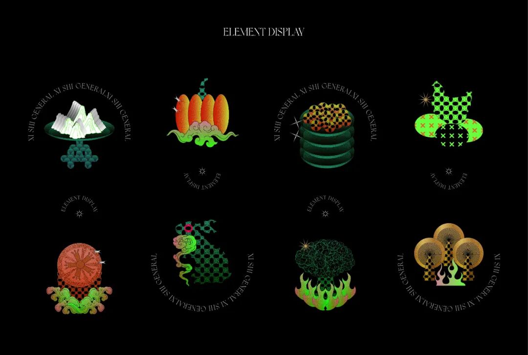 设计灵感来源于中式圆窗与园林中的圆形洞门。在盒型上融入圆窗效果,把包装做成一种可以探见的多重景象,以增加视觉层次感。在包装内部的图形上,将茶饮原材料作为基本的设计单位,以中式花纹中对称、强调中心感的设计方式,延展成了一套图形,用以融合茶饮的「具有功能性」与「使用传统原材料」的卖点。
