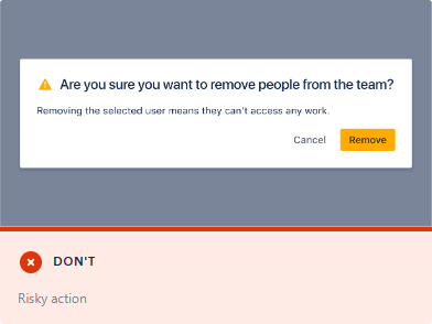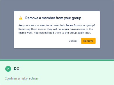 按钮的要求就更多了,要求使用 1-2 个命令式动词(例如“删除”或“创建”,而不是“确定”或“好的”),允许拒绝、取消或退出。操作按钮作为标题的补充向用户明确下一步操作。但如果没有必要,也可以不展示。