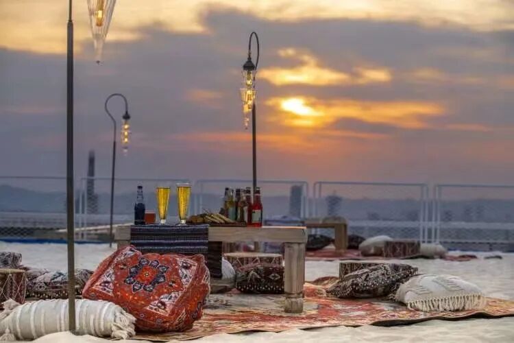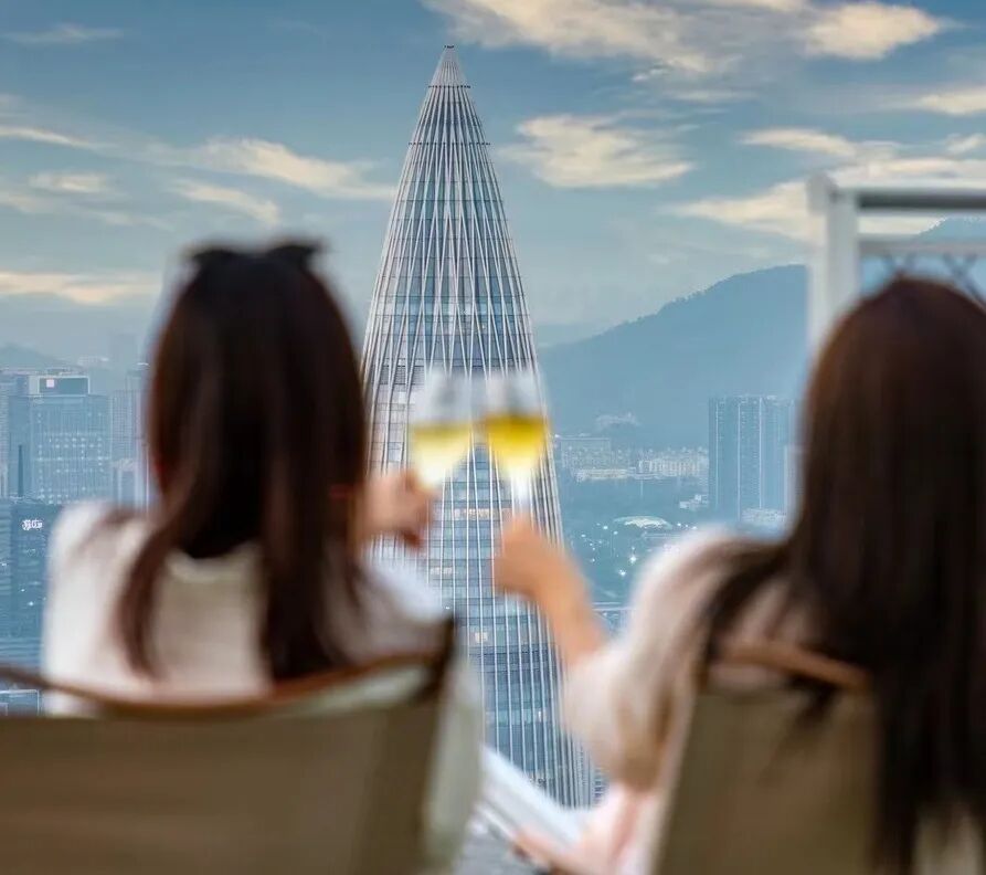深圳鹏瑞莱佛士酒店精准捕捉到时下新兴的“露营文化”,并且将天幕架到停机坪350米高的云端天际,在停机坪露营用餐即可尊享玫瑰色日落的深圳湾海岸线及手可摘星的如钻天光。