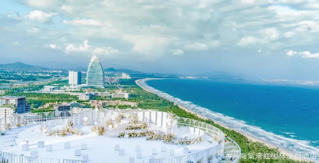 三亚海棠湾红树林度假酒店的空中停机坪,约高100米,在停机坪上,可以欣赏270度无敌海景,拍摄背景一片碧海蓝天。